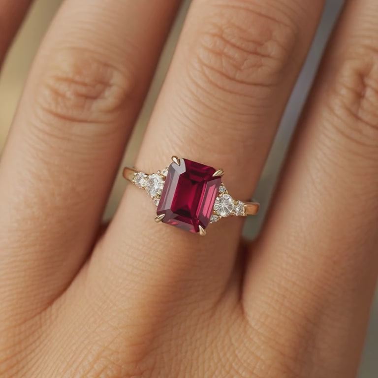 Let's talk about The Bella Jewel - this ring is not messing around. At its heart sits a deep red emerald-cut moissanite that's so vibrant, it commands attention. It's got the kind of fiery sparkle that makes diamonds do a double-take, and it comes with a price tag that won't break the bank.