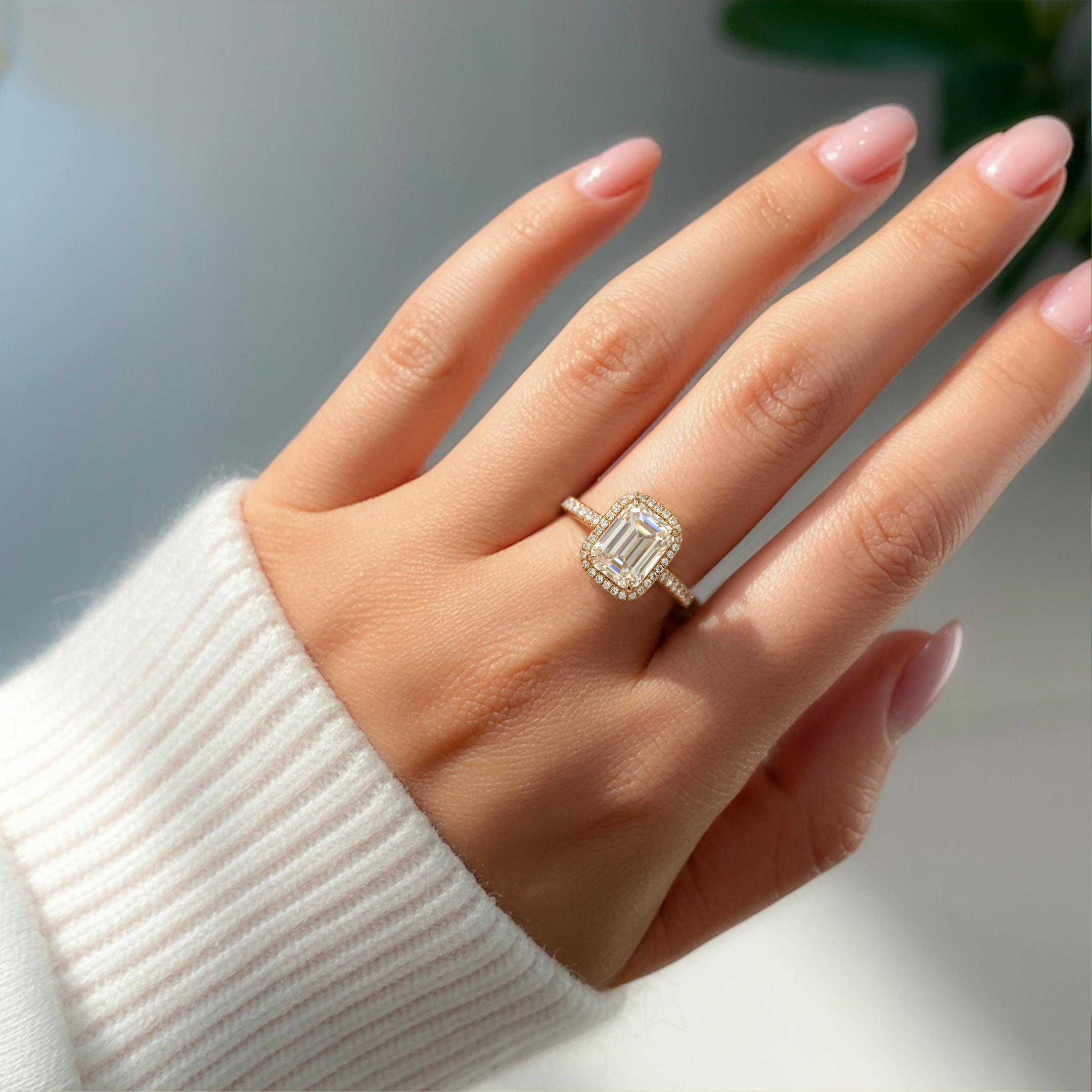 Let's talk about The Bella Jewel – this ring is not messing around. At its heart sits an emerald-cut moissanite that's so clear, that you might mistake it for a chunk of pure starlight. It's got the kind of sparkle that makes diamonds do a double-take, and it comes with a price tag that won't break the bank.