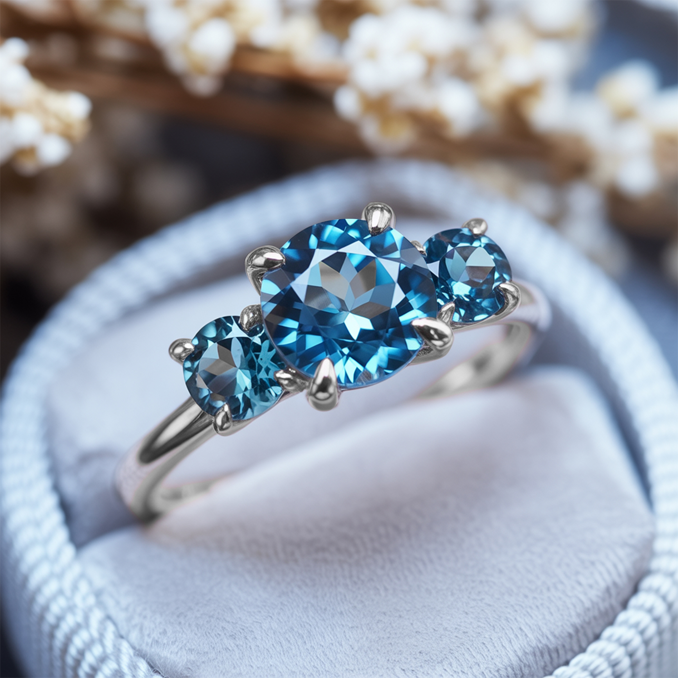 The Bethany 1.5CT Round Cut Blue Moissanite Three Stone Ring