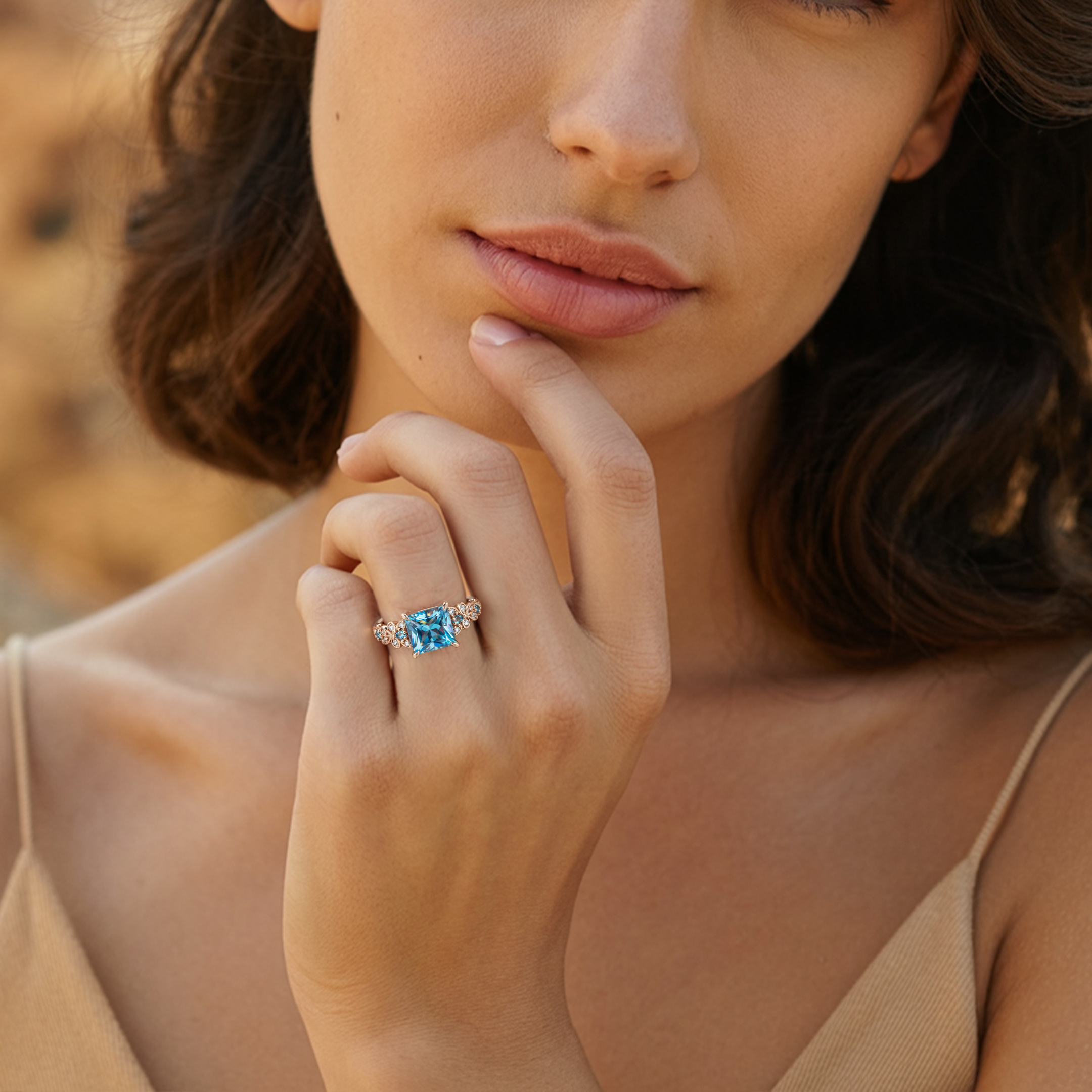 Crafted with meticulous attention to detail, the delicate side stones gracefully intertwine to form a blossoming motif around the vibrant princess cut moissanite. Set in 18K rose gold vermeil, the warm hue of the metal enhances the cool blue of the stone, creating a truly unforgettable aesthetic perfect for those who appreciate both classic charm and a touch of modern color.