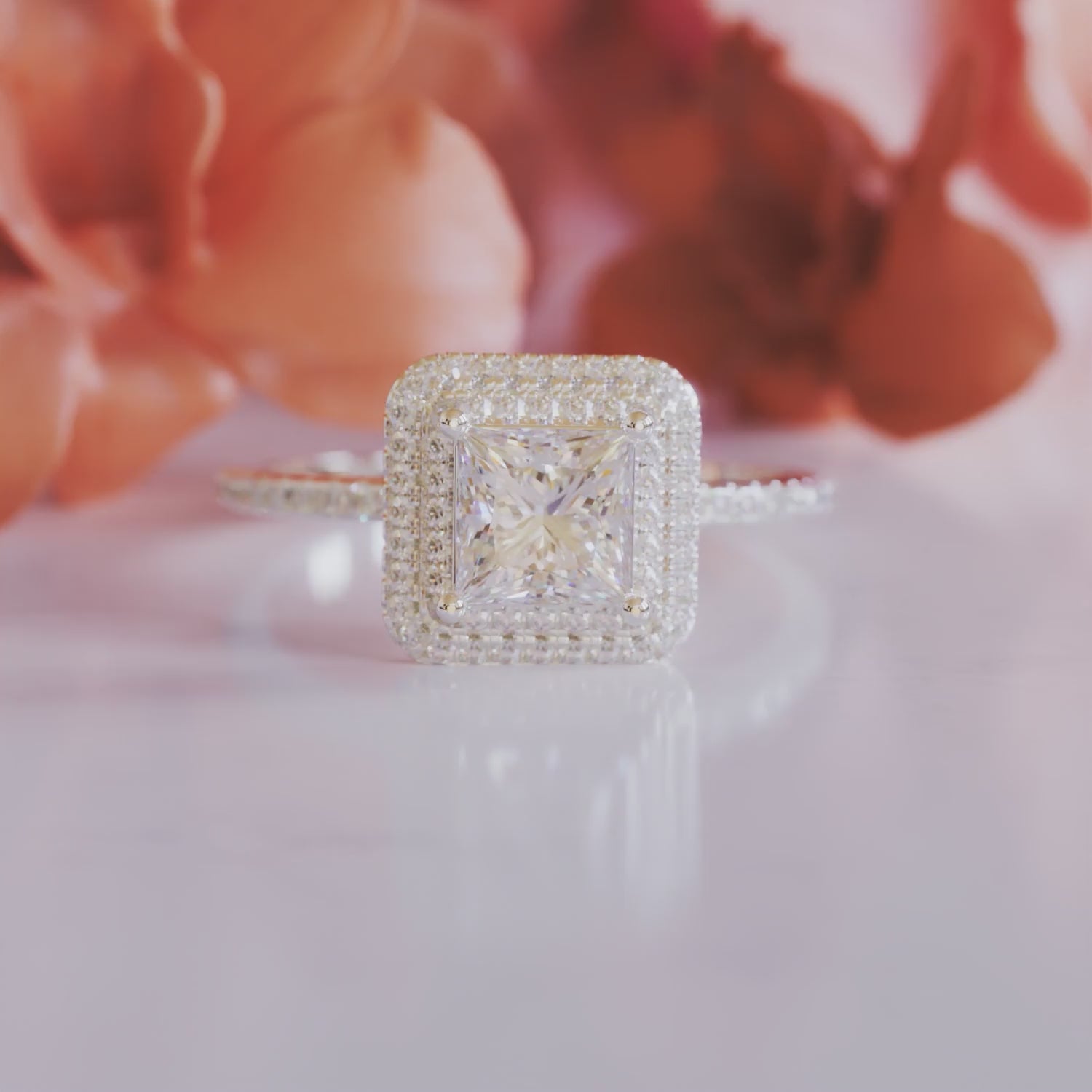 Dazzling Brilliance: Features a 1CT Ideal Princess Cut Moissanite Stone with a double halo design for unmatched sparkle.