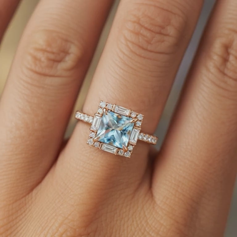 Discover The Calliope, a truly distinctive ring featuring a vibrant blue princess cut moissanite set in warm 18K rose gold vermeil. This piece combines intricate design with a bold color, making a sophisticated statement.