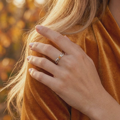 Nature rarely delivers the perfect shade of golden topaz without internal inclusions or uneven saturation. We engineered the solution. This crossover ring features a center-cut Simulated Topaz, color-calibrated to the ideal honeyed warmth of a museum-grade November birthstone. The result is a deep, consistent glow that outshines traditional mined stones.