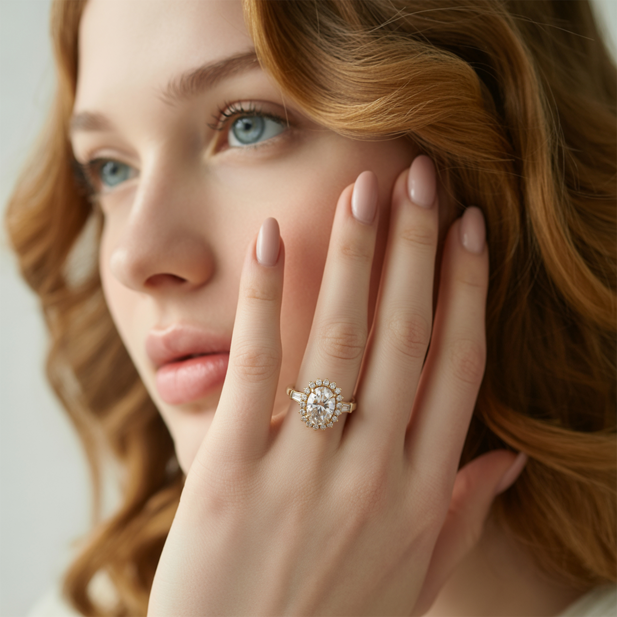 The Callisto ring features a breathtaking 3CT oval cut moissanite, surrounded by a radiant halo and accented with striking emerald baguette side stones.