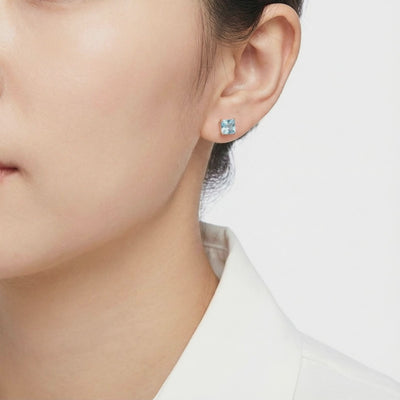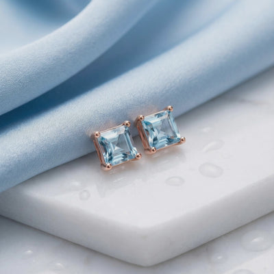 Mined aquamarines are often pale, cloudy, or filled with inclusions. These March birthstone earrings feature Simulated Aquamarine, color-calibrated to the ideal "Santa Maria" light blue benchmark. Precision-cut into a princess shape, we engineered these stones for maximum light return and a saturation level that nature rarely achieves.