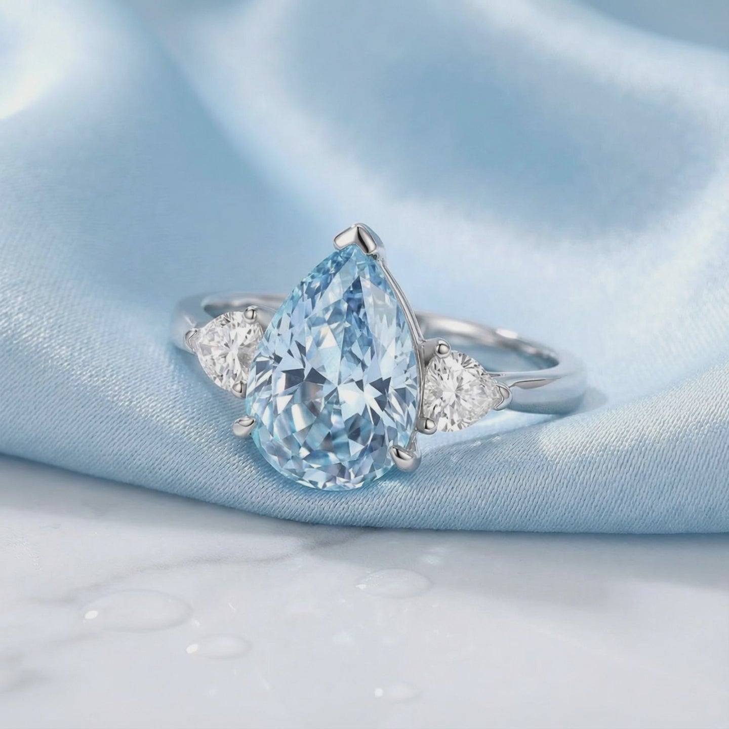 Nature rarely delivers a light blue aquamarine with this level of optical perfection. Mined stones often contain cloudy inclusions and inconsistent color. We engineered the Calysia ring to replicate the absolute ideal visual profile of a museum-grade March birthstone, featuring a precision-cut pear center stone flanked by high-brilliance accents.