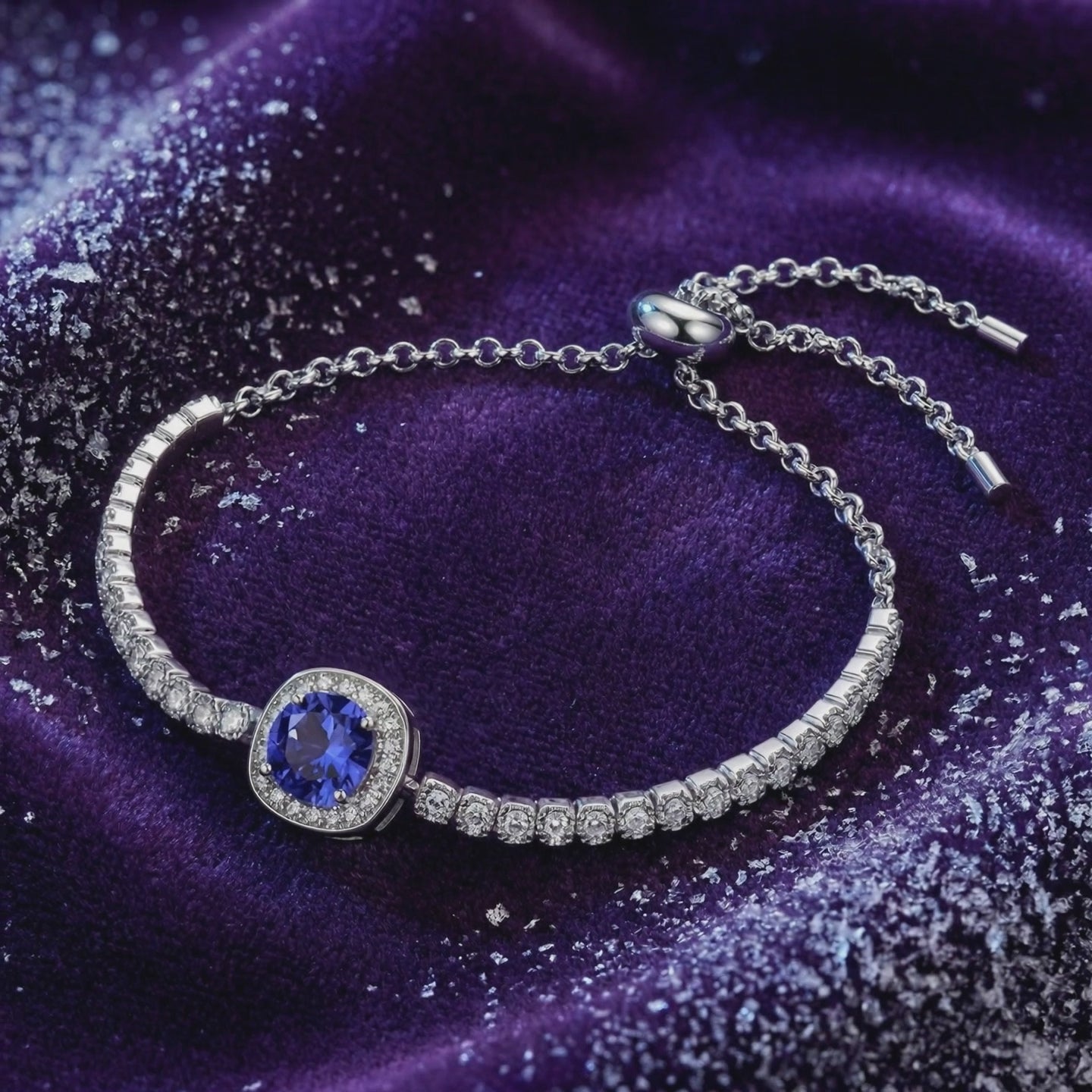 Mined tanzanite is often inconsistent in its saturation. We engineered the ideal. This December birthstone bracelet features a Simulated Tanzanite, color-calibrated to achieve the deep blue-violet profile and trichroic shifting hues found in museum-grade stones. Every stone is precision-cut for maximum light return, ensuring a flawless visual profile that nature rarely delivers.