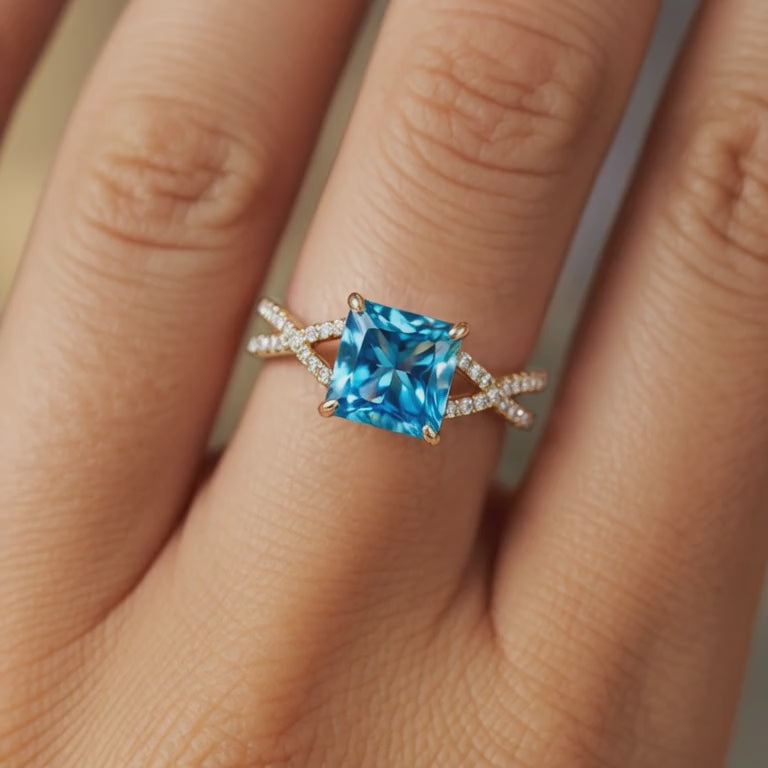 The Caterina 1CT Princess Cut Blue Moissanite Ring. Experience the eternal symbol of love gracefully wrapped around your finger, with 2.5x More Sparkle Than Diamonds and 90% Less Cost.
