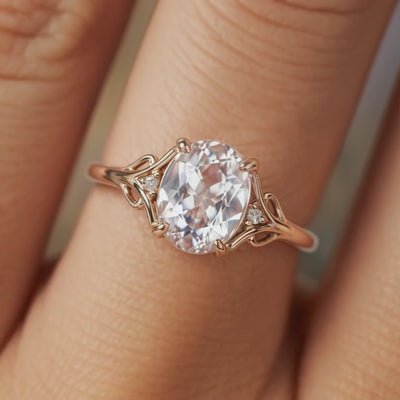 The Celandine ring presents a breathtaking 5CT oval cut moissanite set within a uniquely crafted nature-inspired leaf design. This distinctive piece captures the essence of organic beauty with exceptional sparkle.