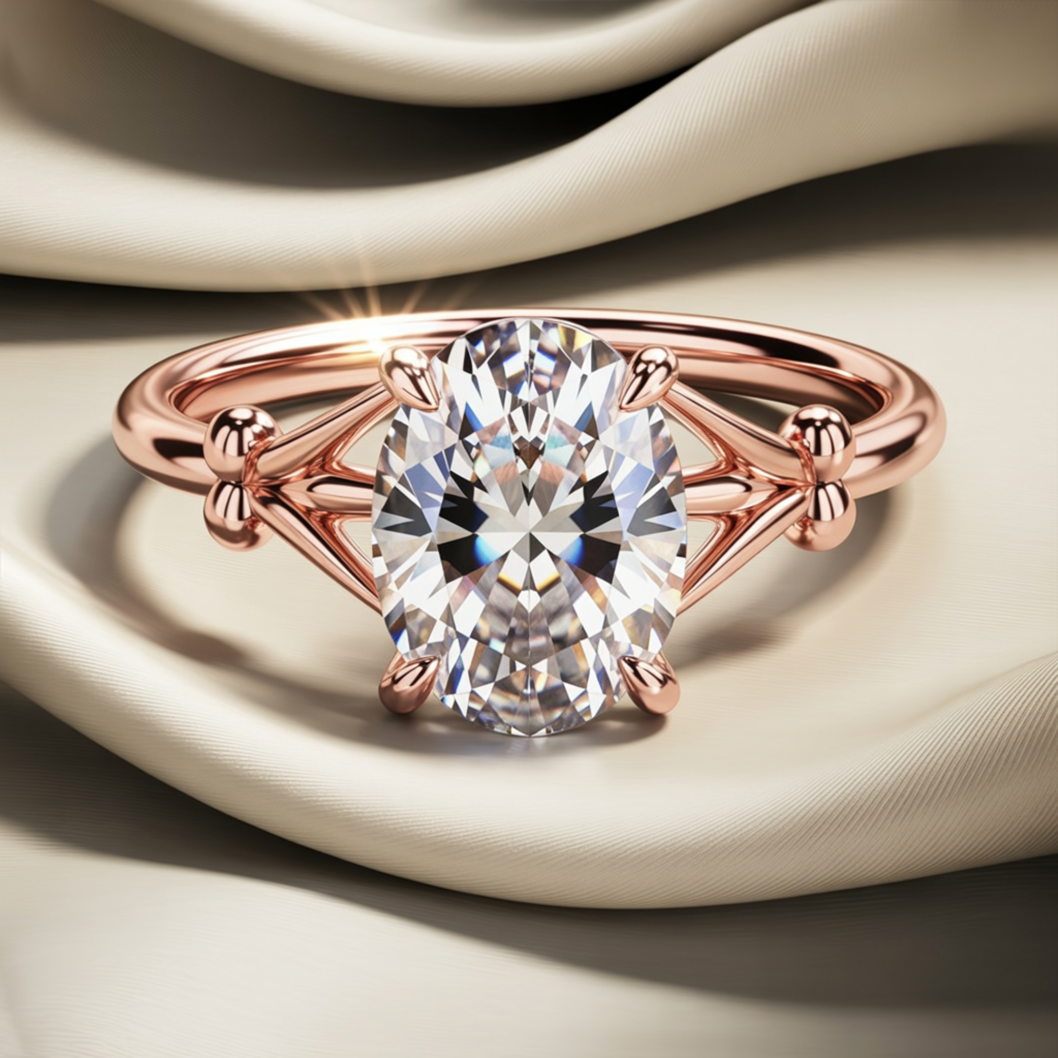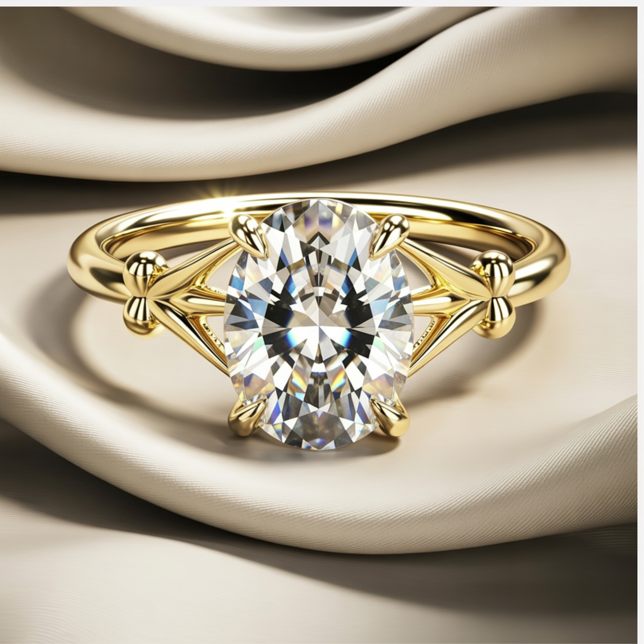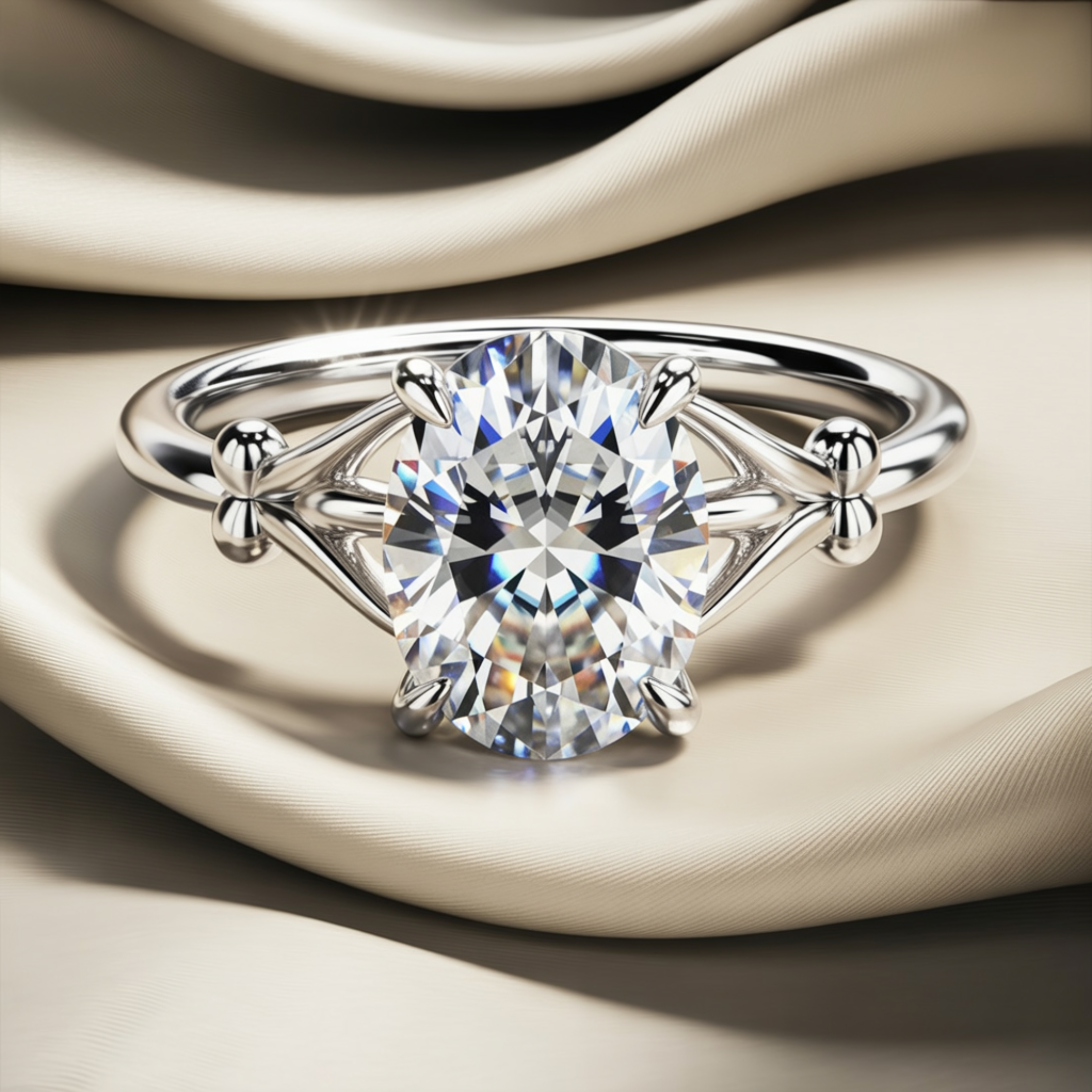 - Features a stunning 2CT oval-cut moissanite center stone in a classic four-prong setting