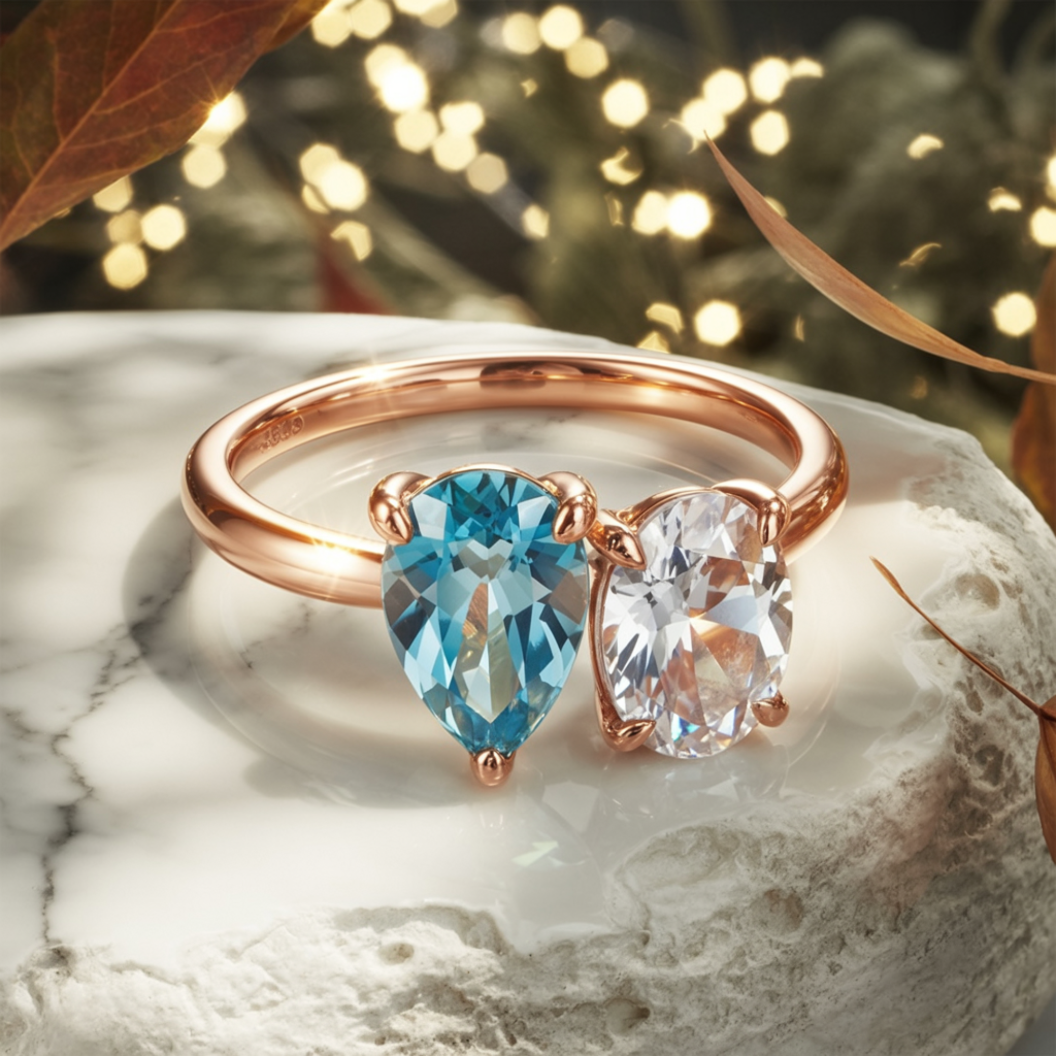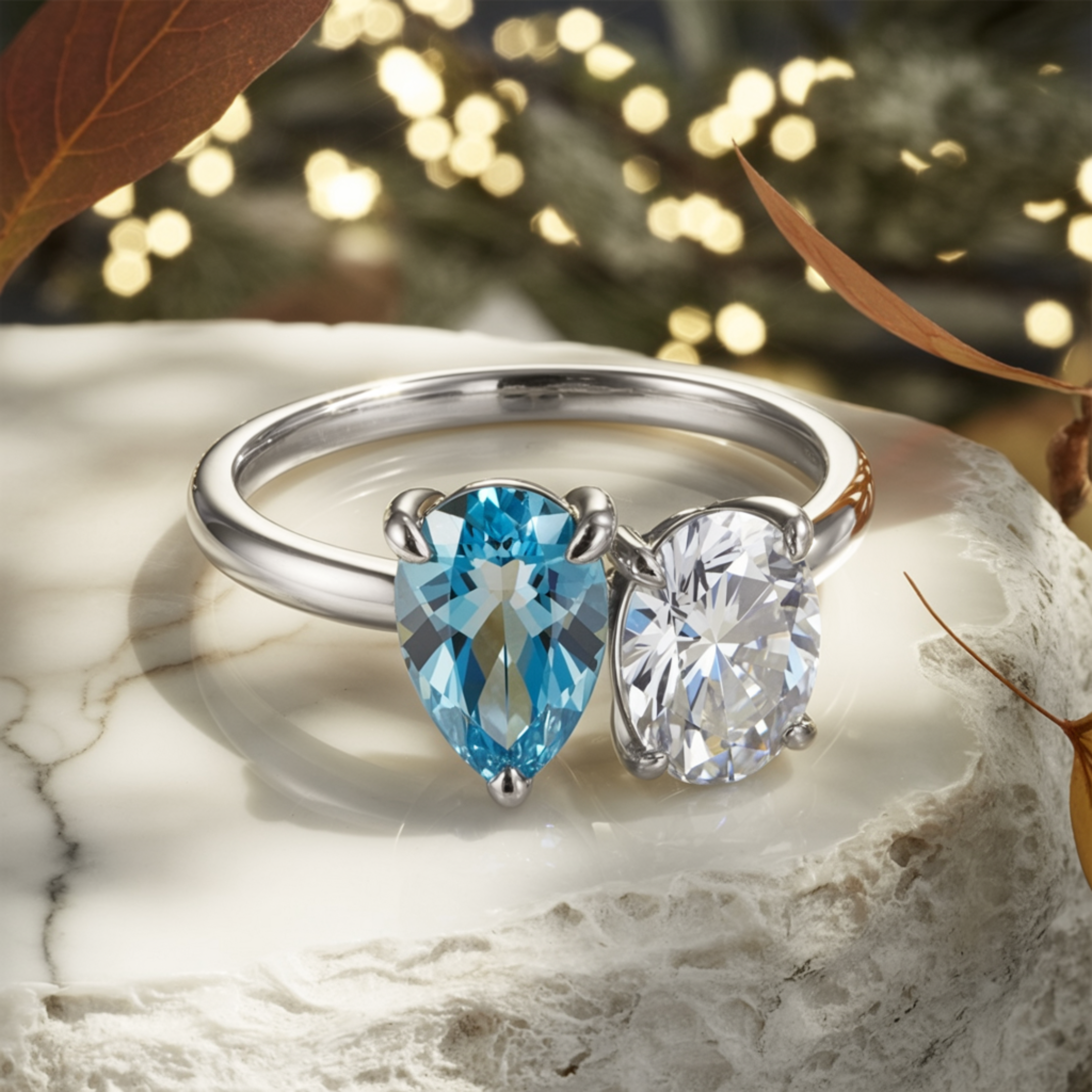 - Center Stones: 1CT Blue Pear Moissanite + 1CT White Oval Moissanite (2CT total weight)