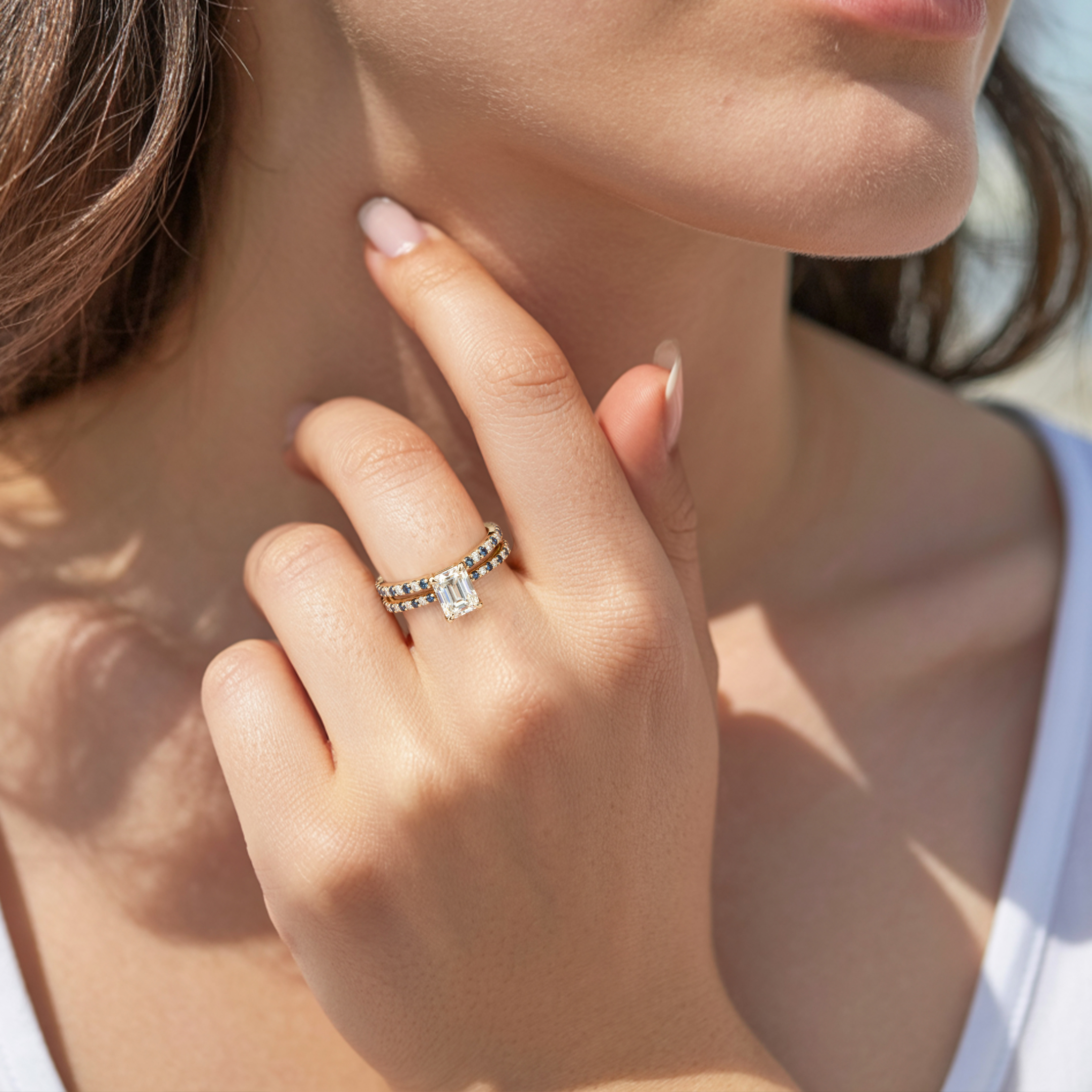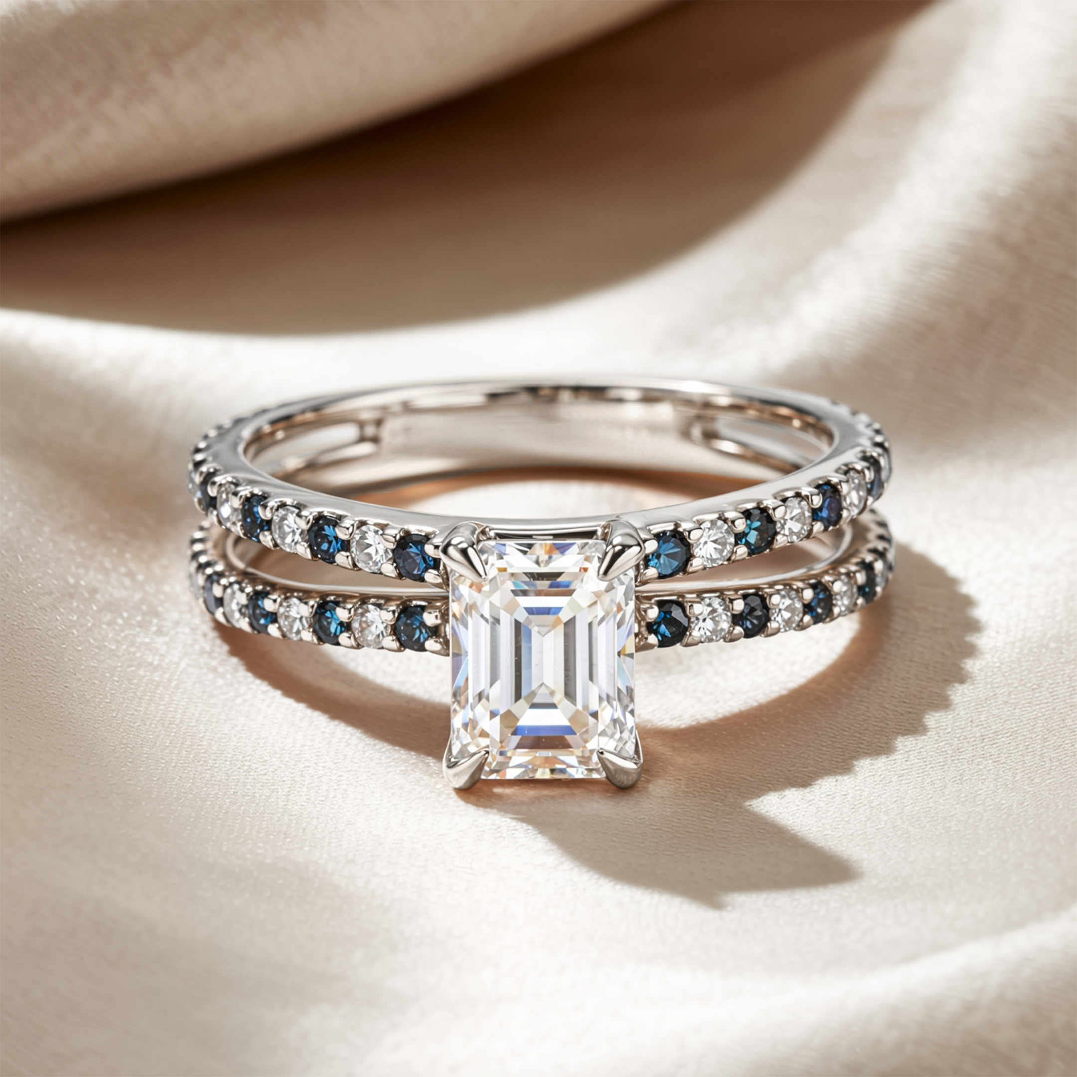 This design features a brilliant 1CT emerald cut white moissanite center stone, artfully framed by a unique split band. Each arm of the band is a full eternity, showcasing a continuous line of alternating blue and white round moissanite side stones. This creates a dynamic visual flow and a captivating play of color and light that truly sets it apart.