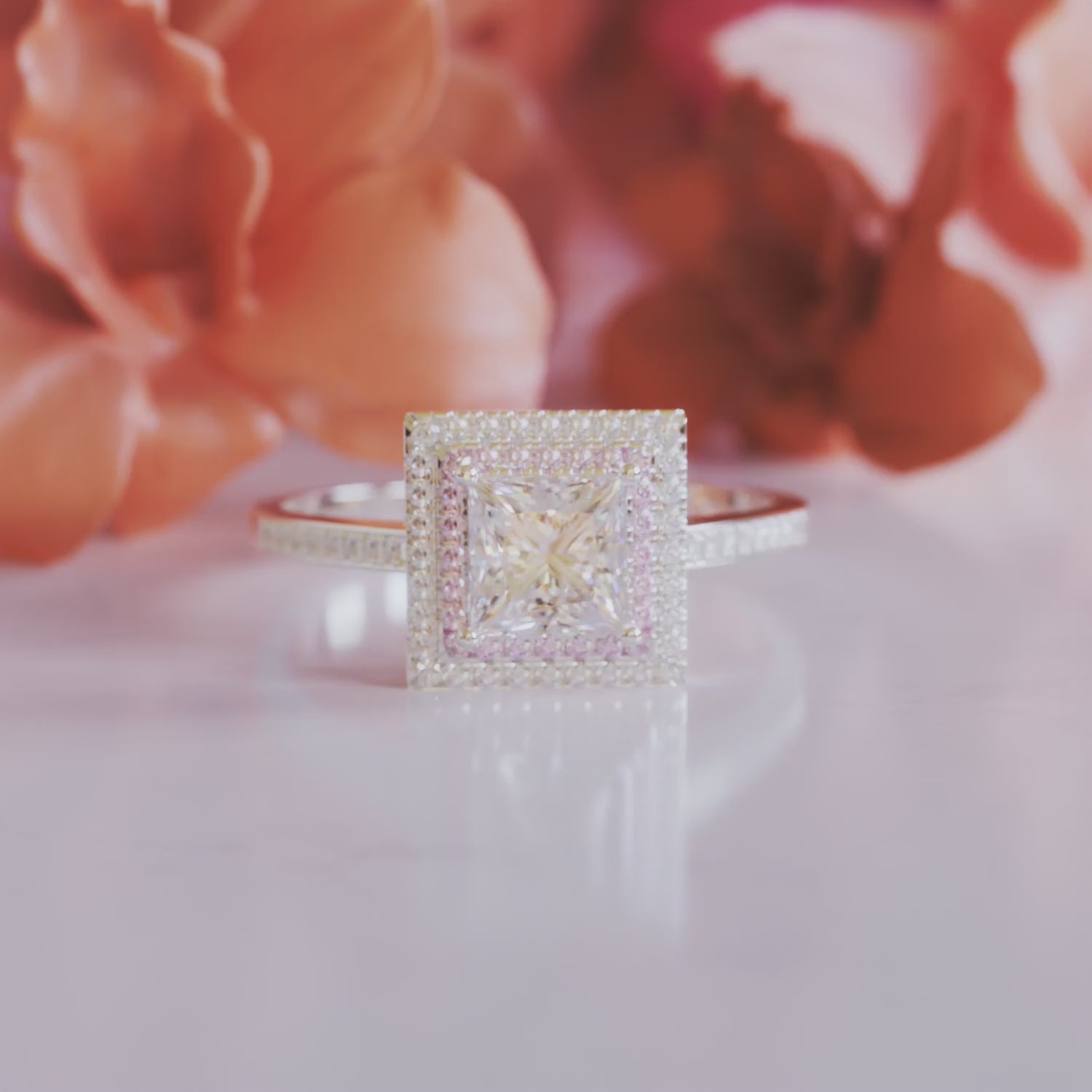 Radiant Design: The Princess Cut Moissanite stone is paired with a halo of high-grade, ethical gemstones for maximum sparkle.