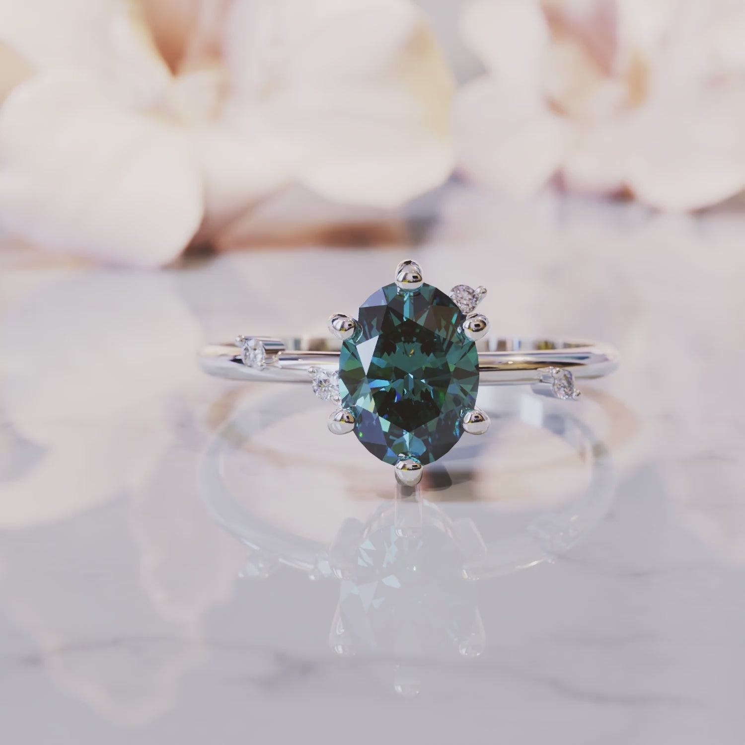 The oval cut gives the Alexandrite that perfect balance of sparkle and elegance. Held securely by a classic 6-prong setting, the ring is as durable as it is beautiful. The band is lined with high-quality lab-grown Alexandrite gemstones, ethically sourced for a guilt-free shine.