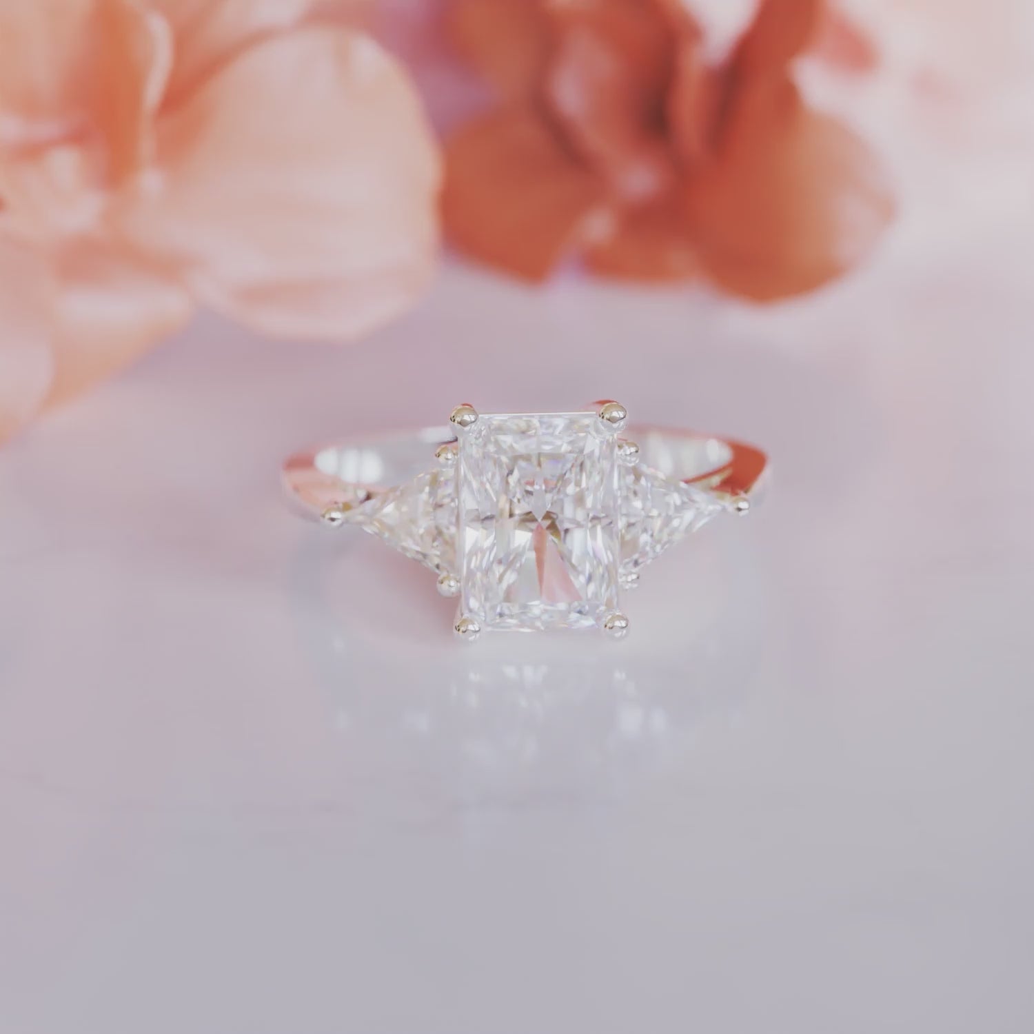 - Stunning 3CT radiant-cut flawless moissanite gemstone and 0.5CT moissanite side stones.