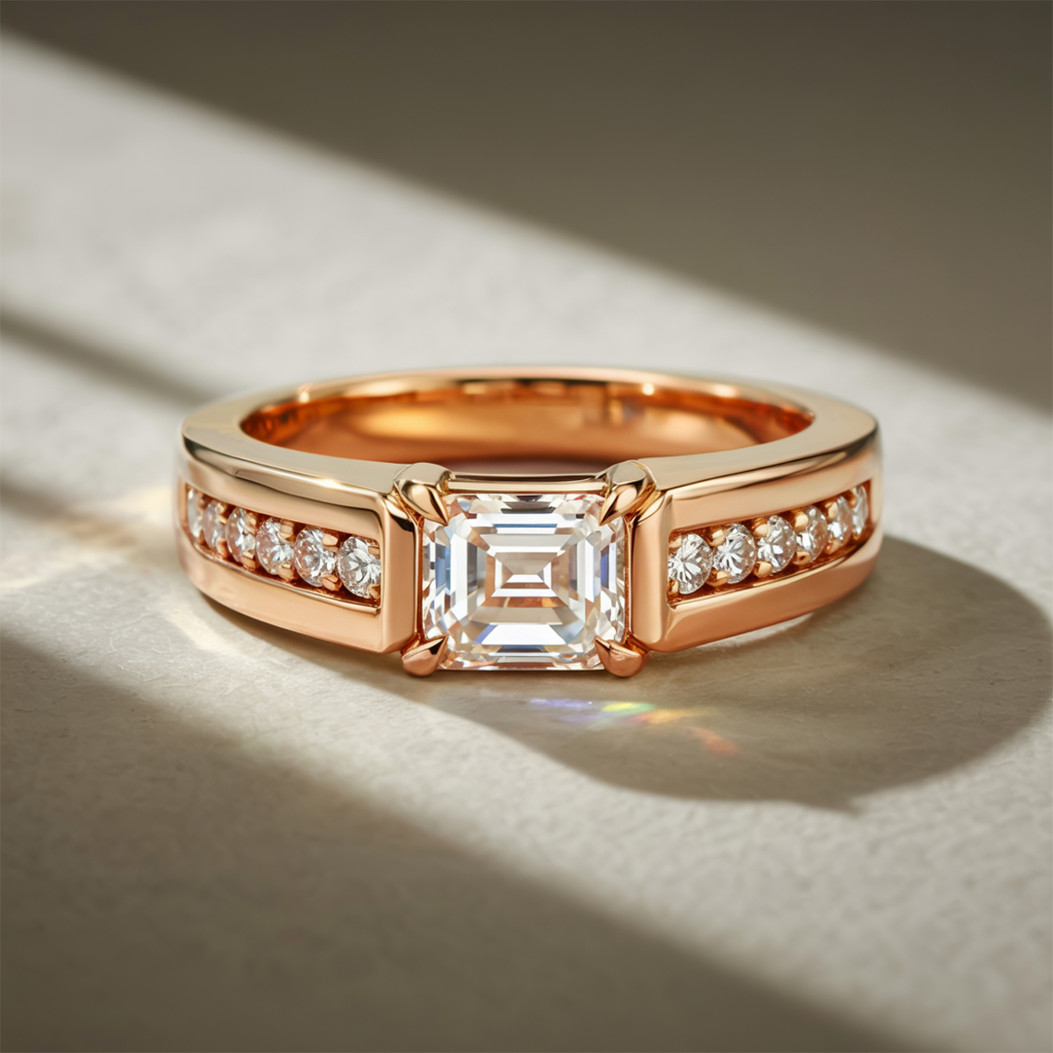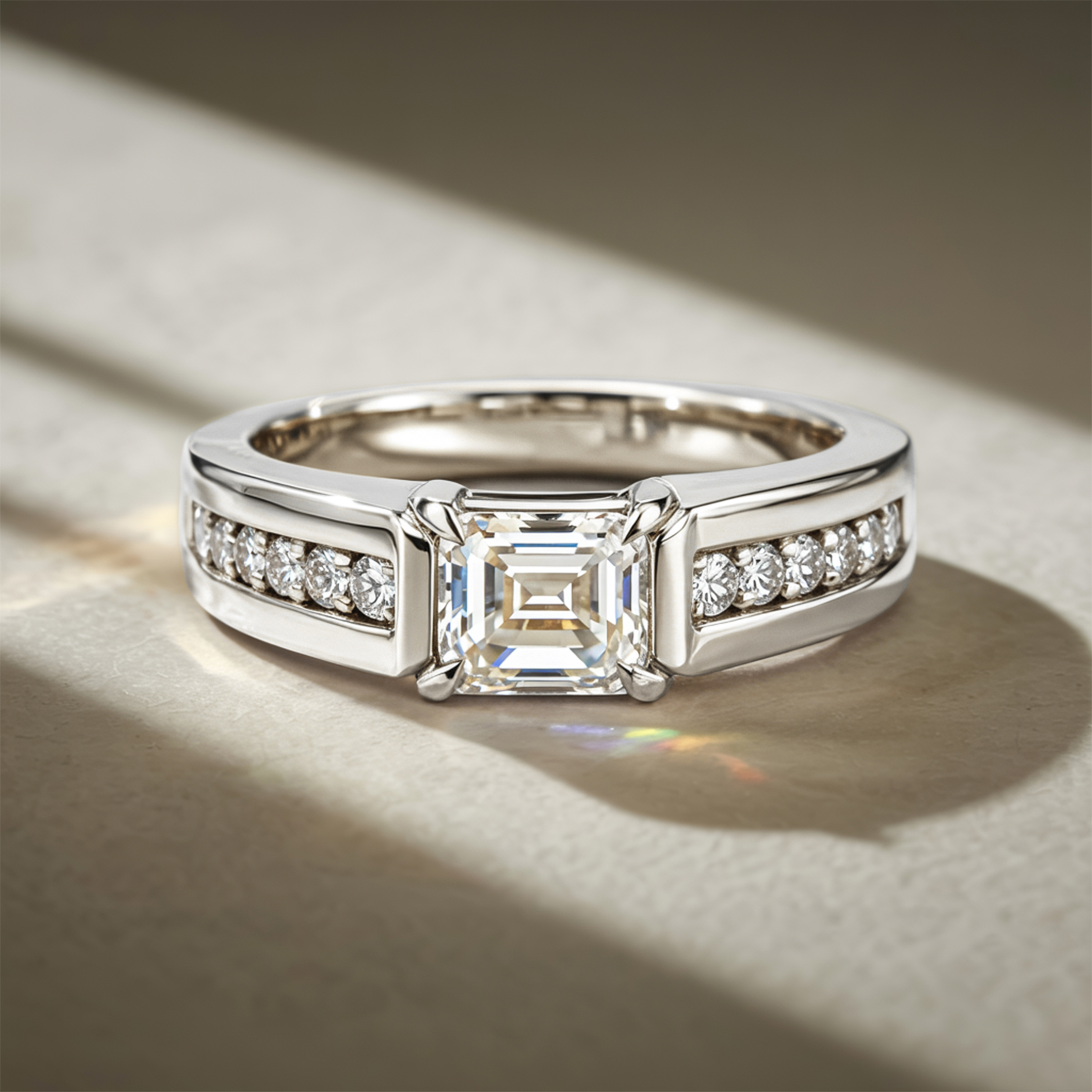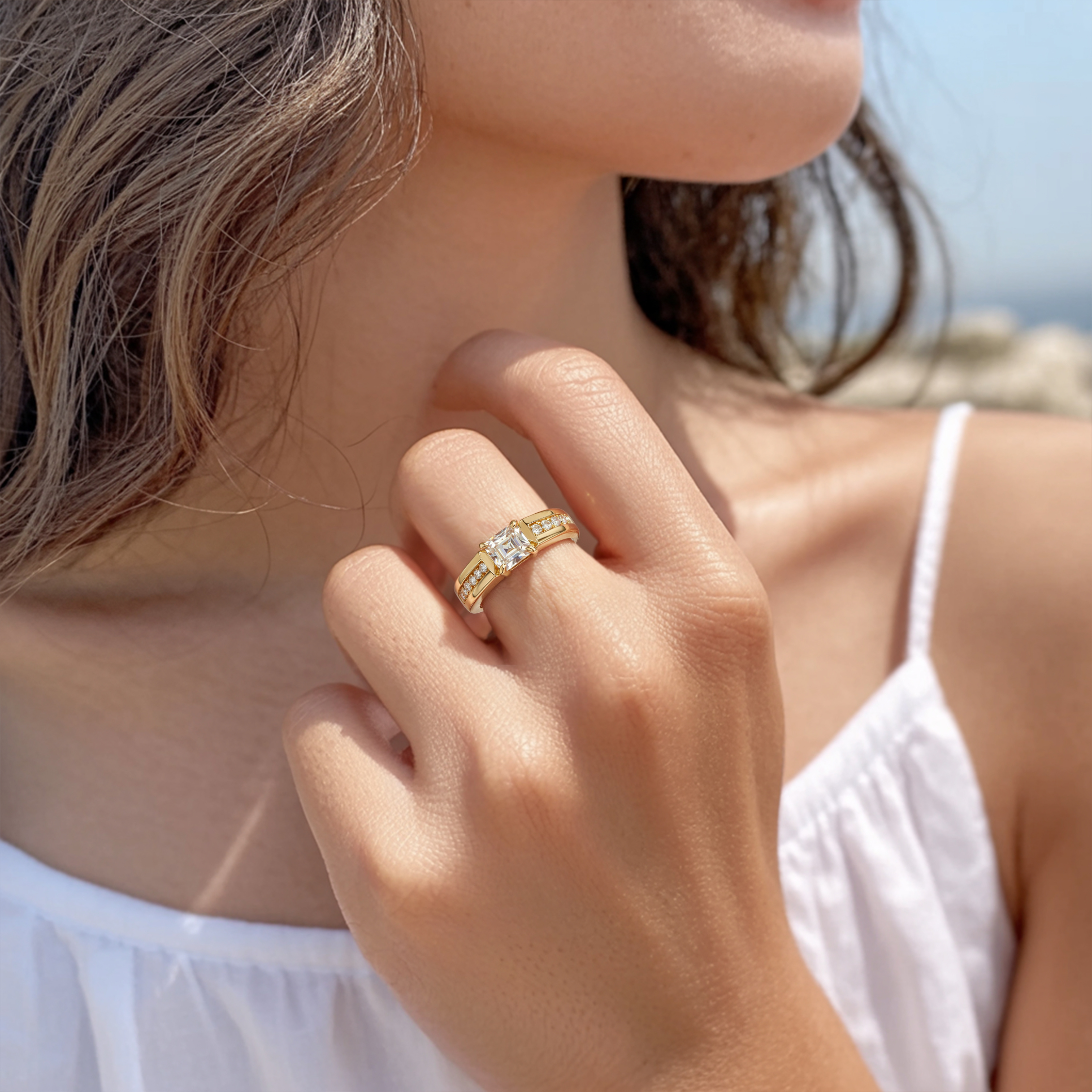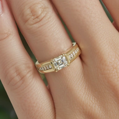Discover The Elara, where modern sophistication meets timeless sparkle. This ring showcases a captivating emerald cut moissanite set horizontally, offering a fresh perspective on a classic design.