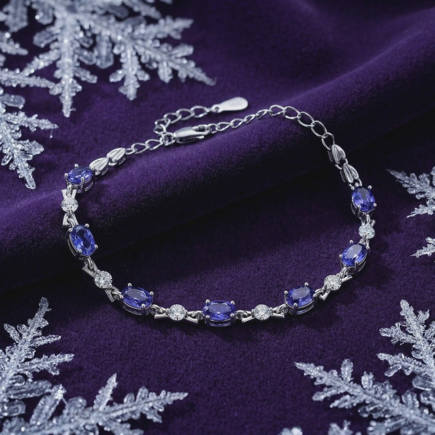 Natural tanzanite is famously rare and often plagued by inclusions that dull its natural fire. We engineered the solution. This bracelet features precision-cut Simulated Tanzanite, color-calibrated to capture the elusive deep blue-violet saturation and trichroic shifting hues found in museum-grade specimens. Each oval stone is faceted for maximum light return, ensuring a consistent brilliance that nature rarely delivers.