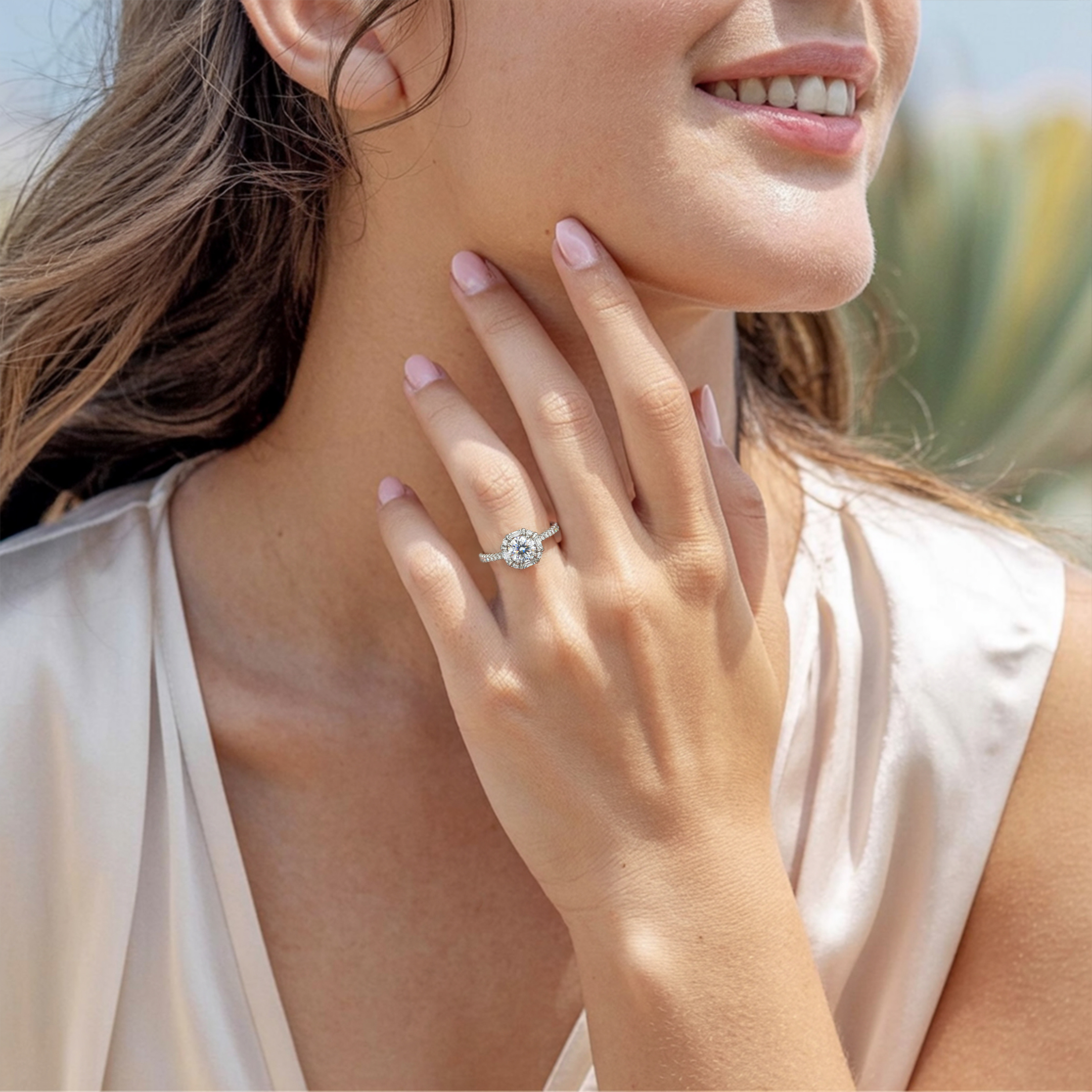 - The dazzling halo design amplifies the center stone's brilliance, making it appear larger and more luminous.