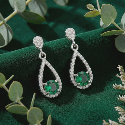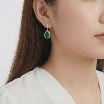 Nature is random; engineering is precise. While mined emeralds are frequently clouded by inclusions and fractures, our Simulated Emerald is color-calibrated to the absolute ideal. These drop earrings feature a precision-cut pear stone held in a protective teardrop halo, engineered to deliver the deep, vivid green saturation of a museum-grade heirloom.