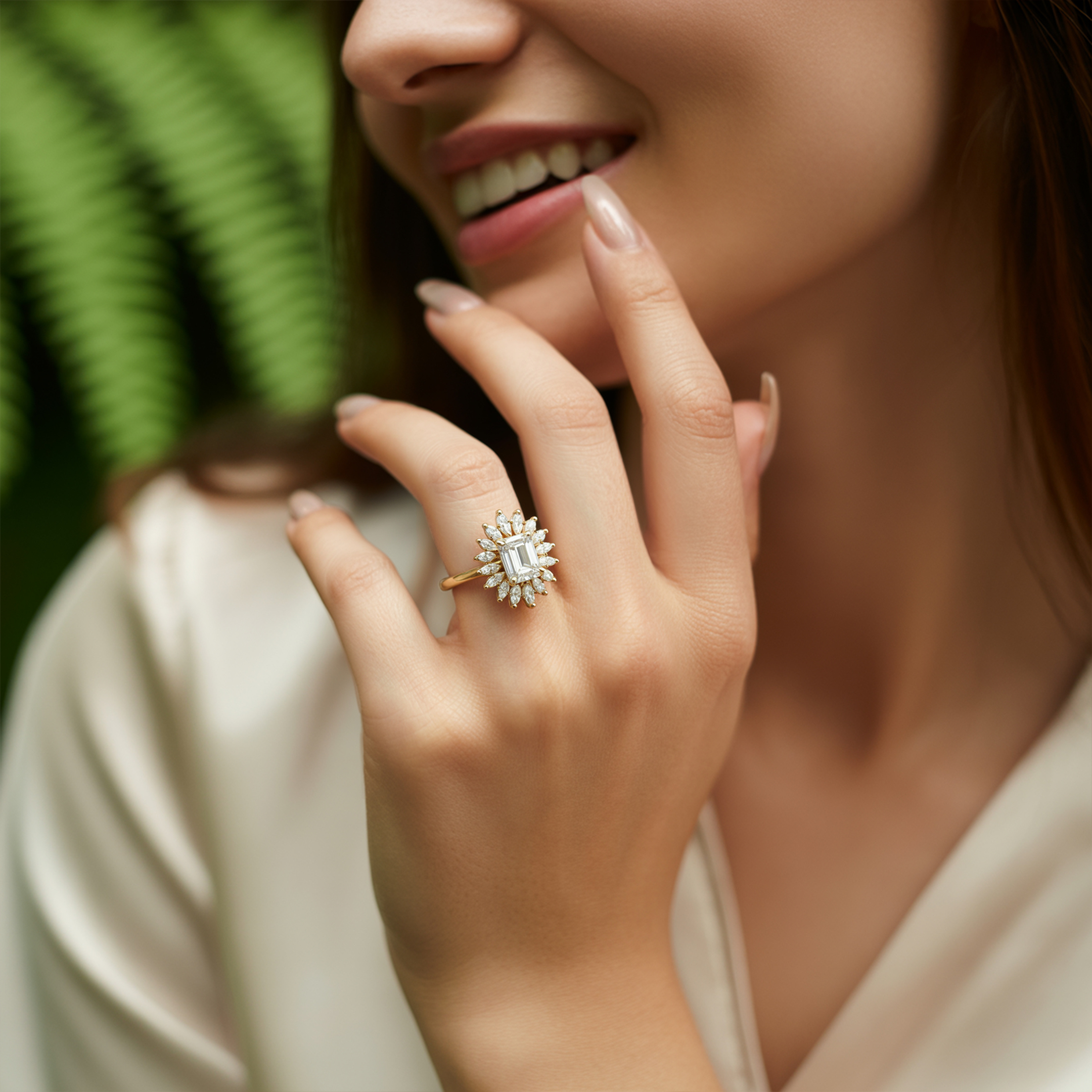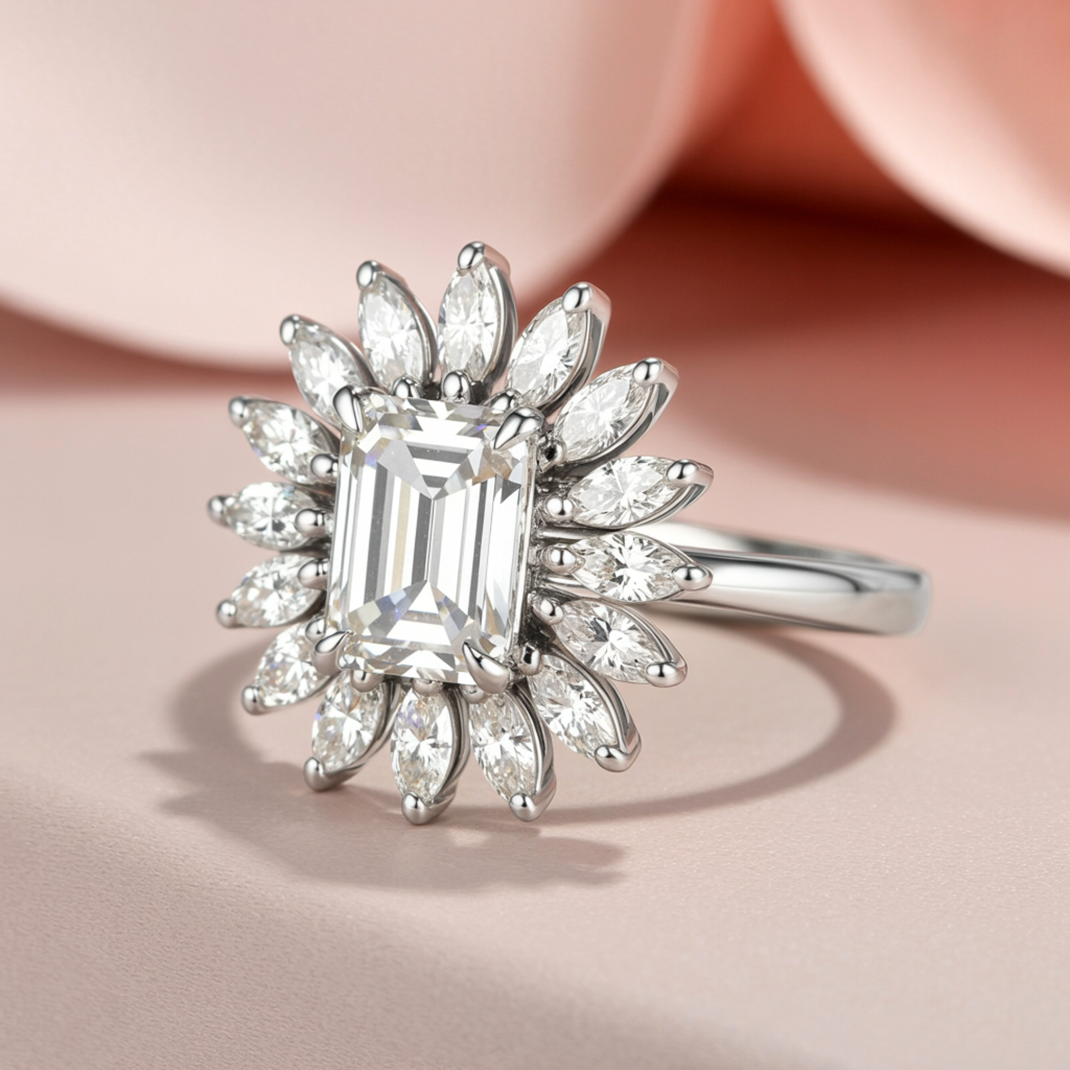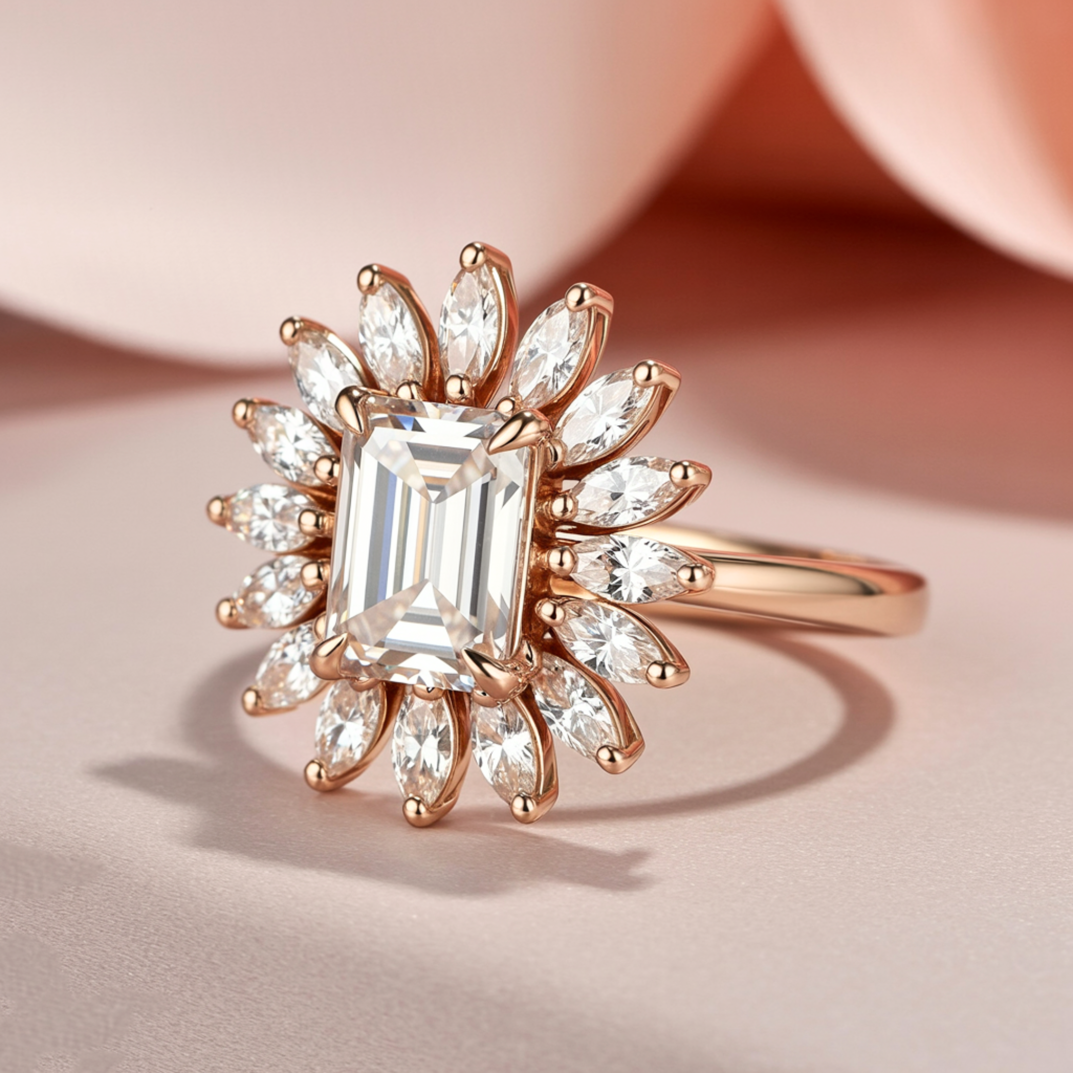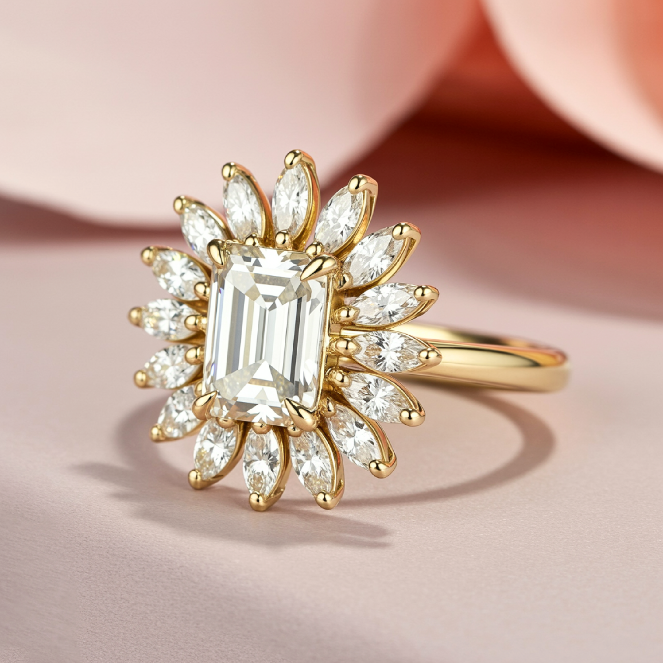 - Ring Design: Sunburst halo with emerald cut center and oval moissanite accents