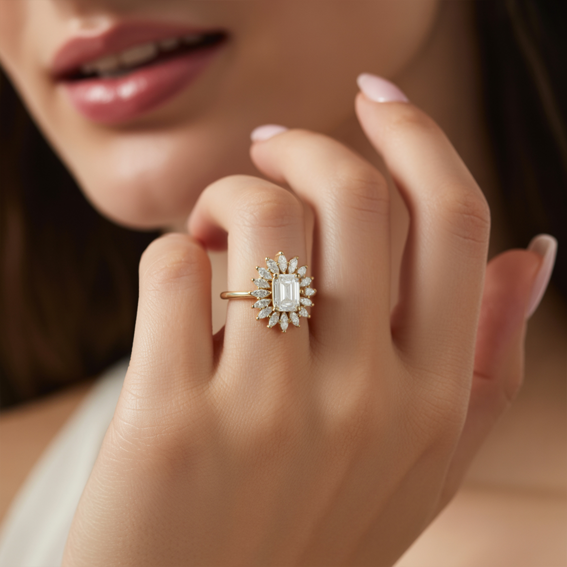 The Estrella ring presents a striking statement piece, centering a crisp emerald cut moissanite within an illuminating sunburst halo.