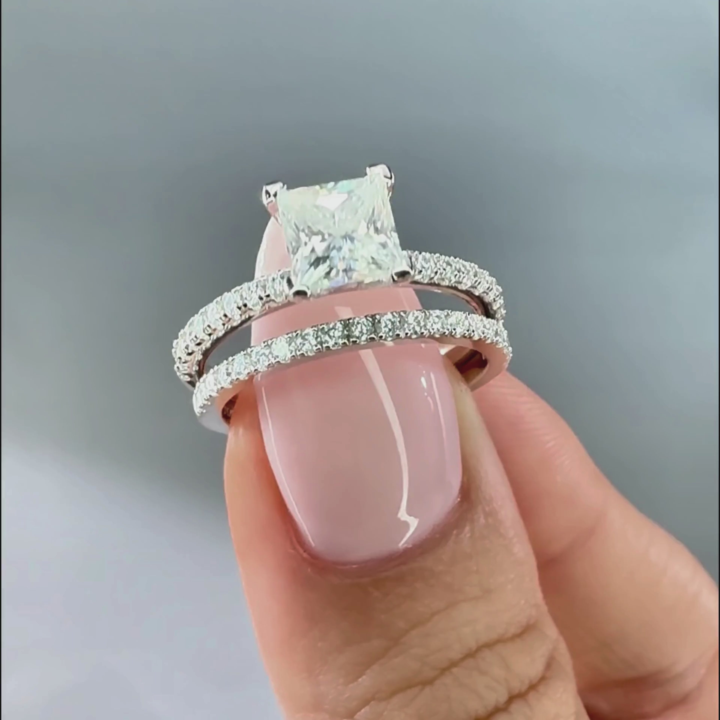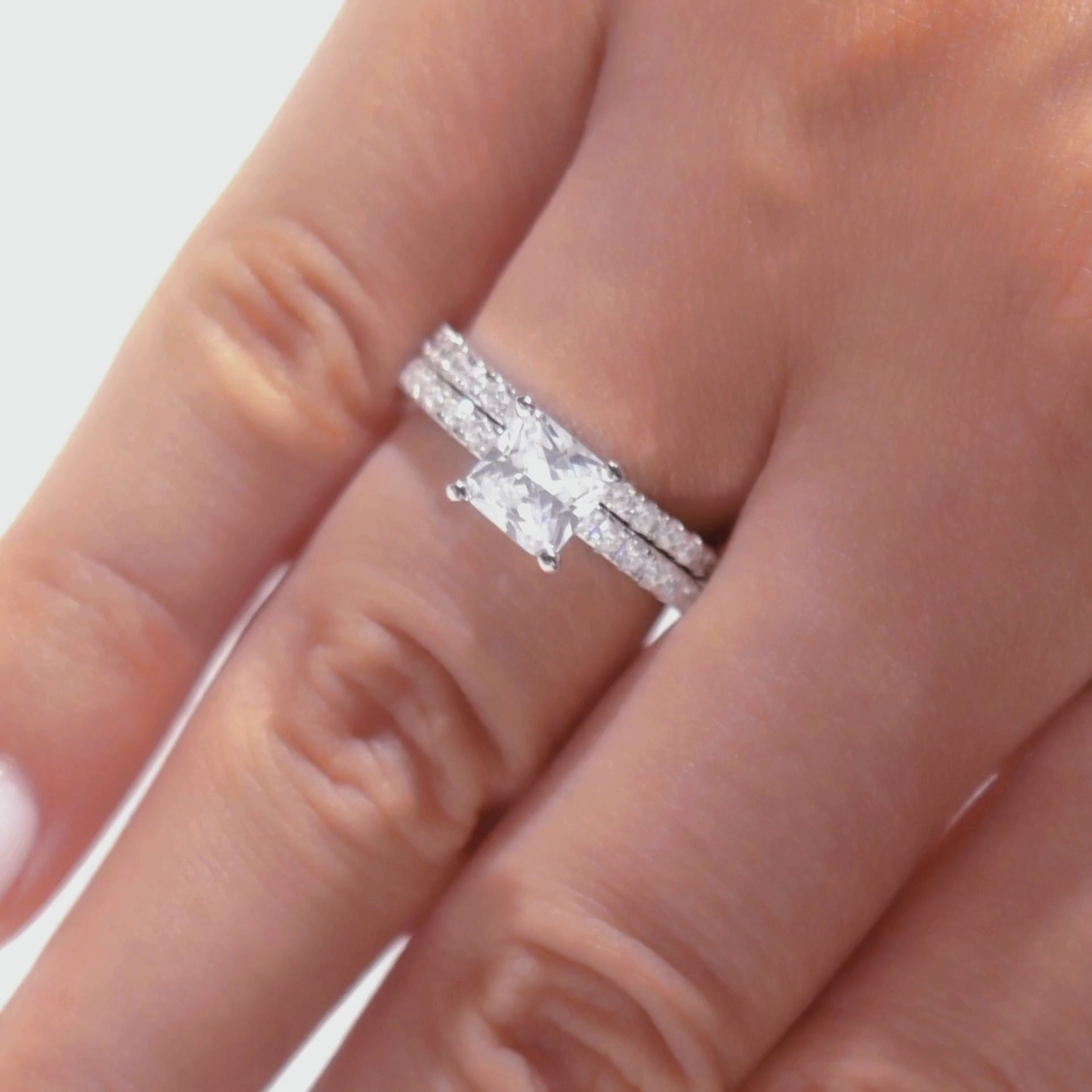 The Euphoria combines classic beauty with a modern touch. This double pavé full eternity ring is crafted from S925 sterling silver, featuring princess-cut simulated diamonds in prong and channel settings.