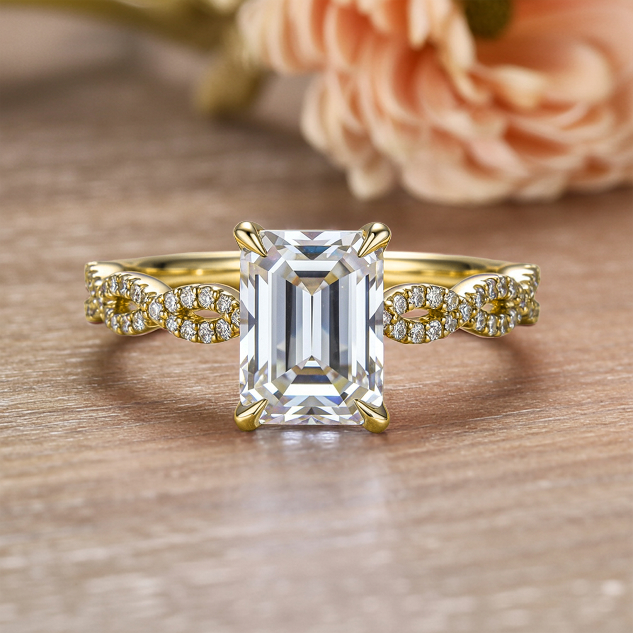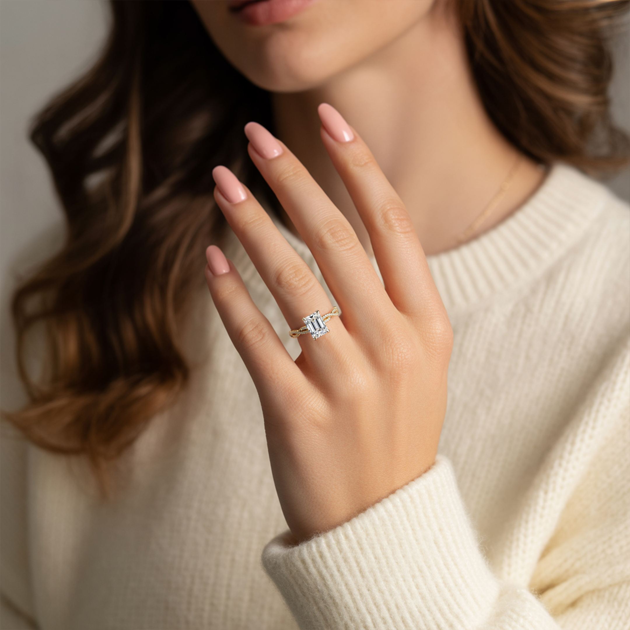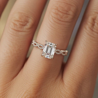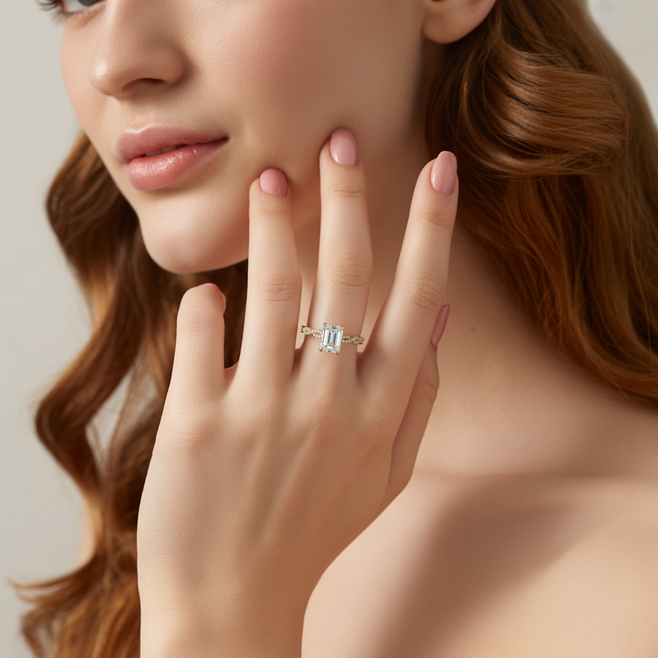 The Everlyne ring features a brilliant 1CT emerald cut moissanite, designed to leave a lasting impression.