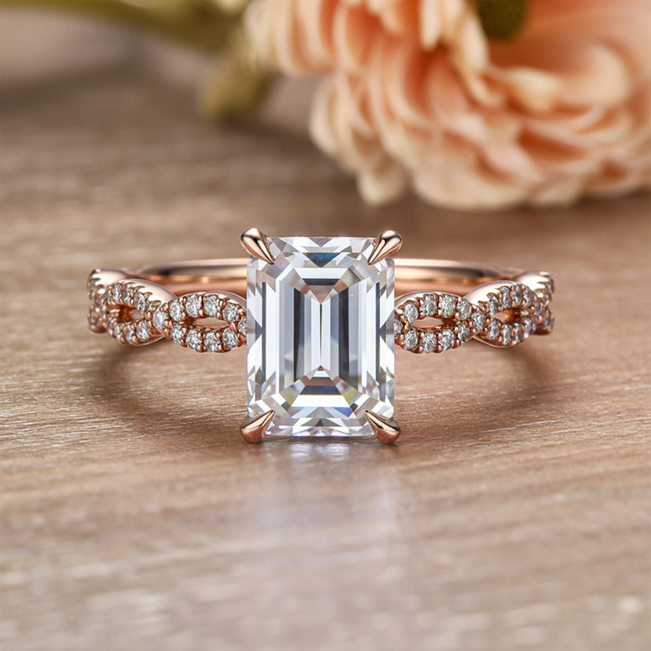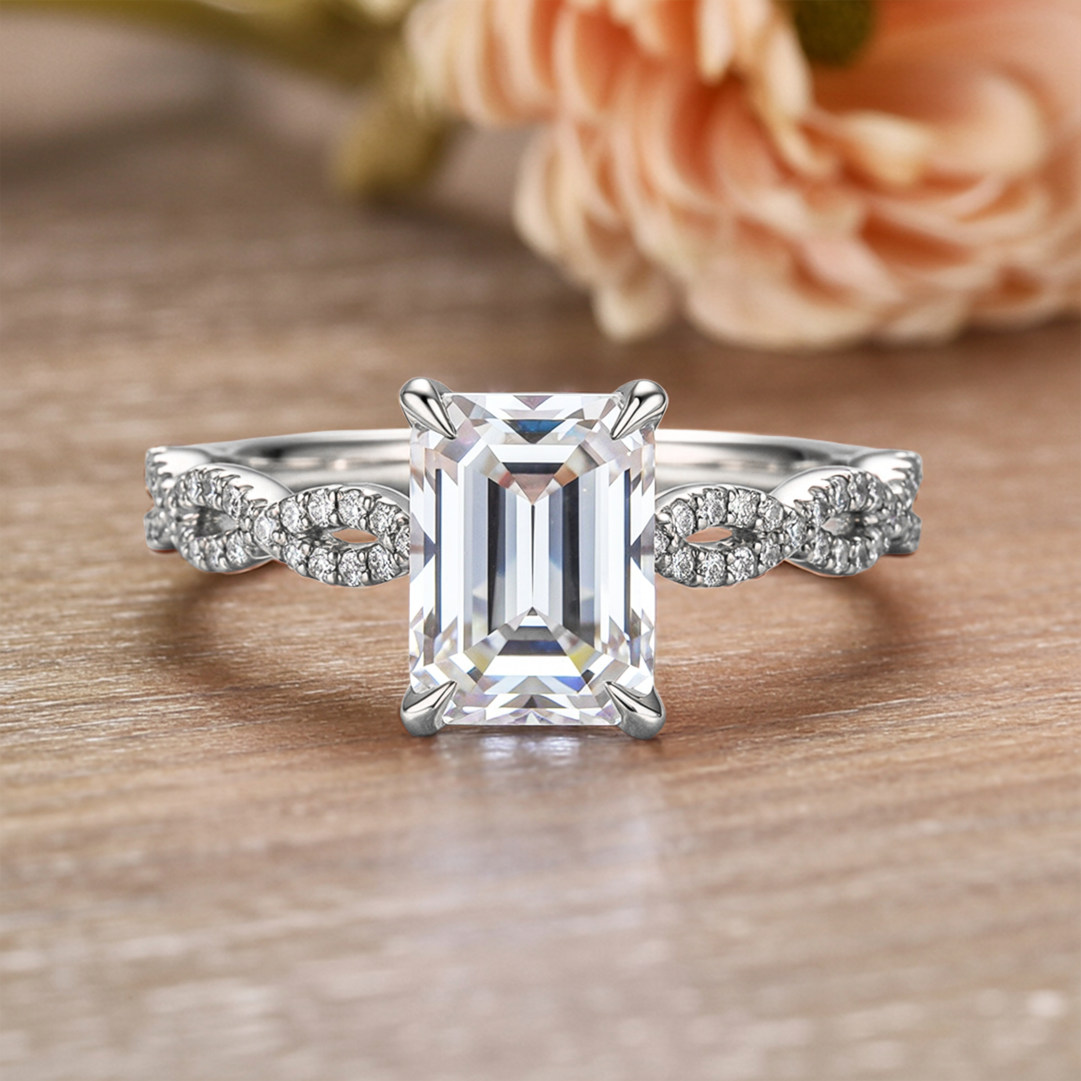 This exquisite ring boasts an infinity pavé eternity band, where each moissanite side stone flows seamlessly, creating an unbroken circle of brilliance. The meticulously set pavé stones enhance the central emerald cut, maximizing sparkle and elegance.