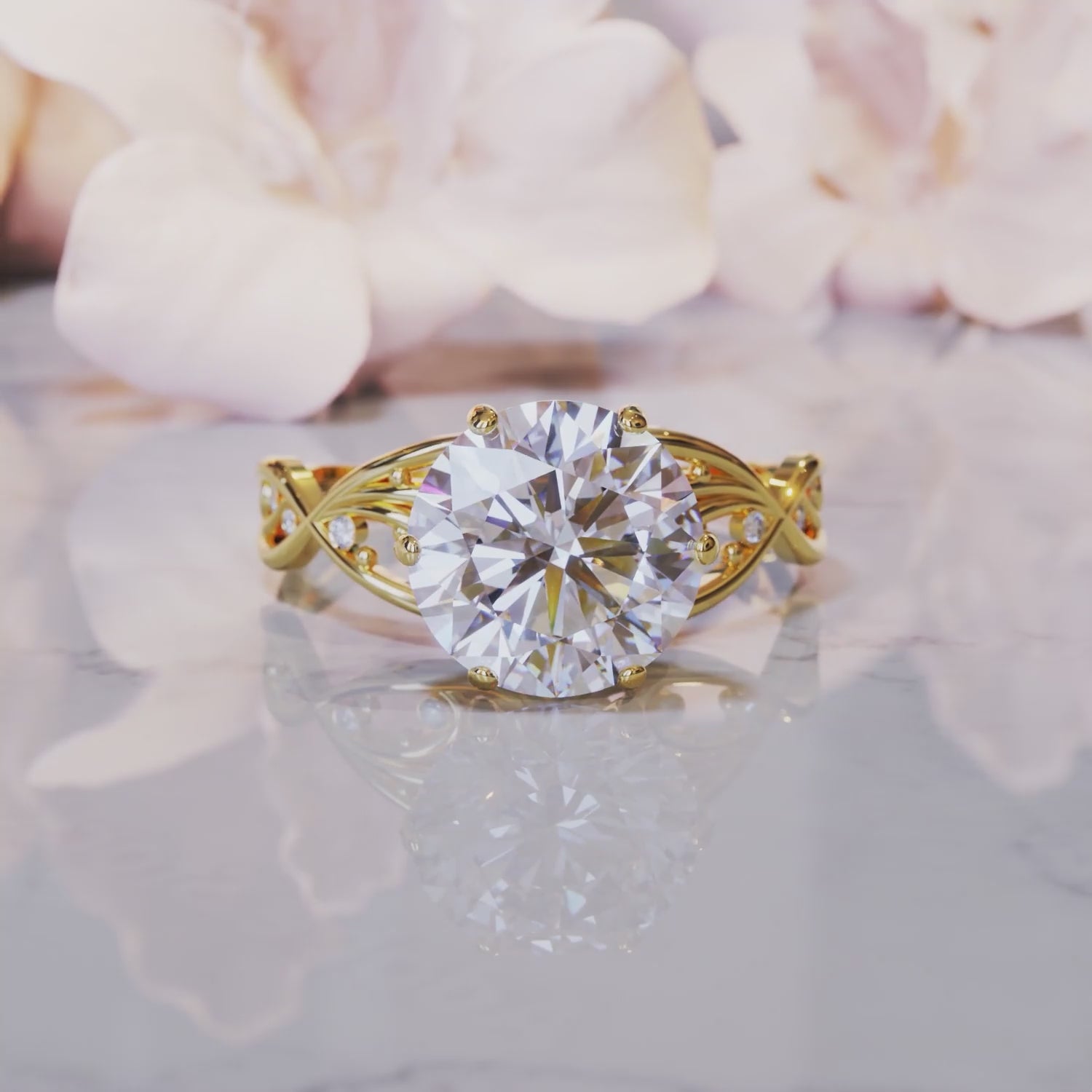 With its 2.5-carat ideal round-cut moissanite stone, The Floral offers timeless elegance and unmatched brilliance. Set in a graceful vintage band design with ethically sourced moissanite gemstones throughout, it dazzles from every angle.