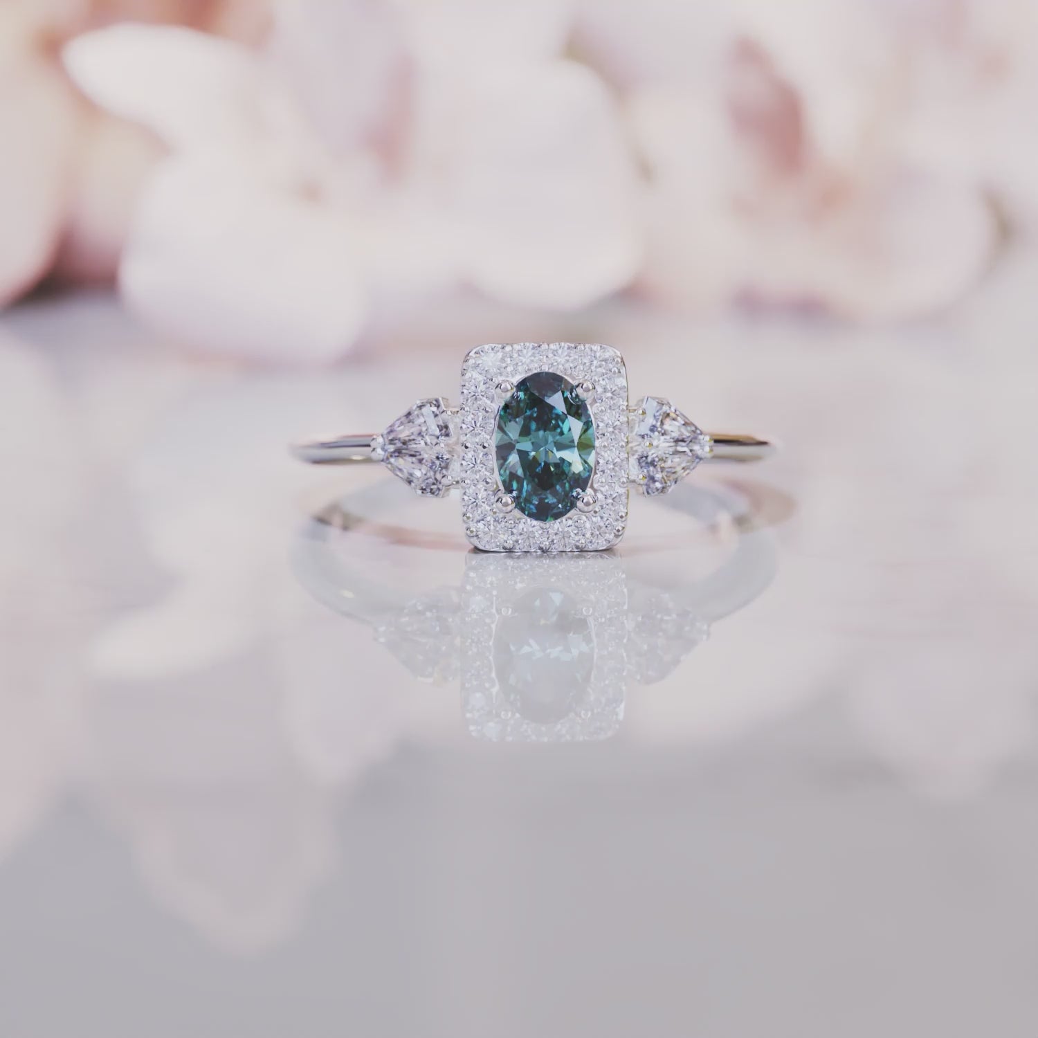 Meet The Inara, a modern Alexandrite ring that dazzles with its color-changing glow and sophisticated style. Featuring a 0.8-carat oval-cut Alexandrite, surrounded by a halo of simulated diamonds, this ring is the perfect choice for engagements, anniversaries, or everyday wear.