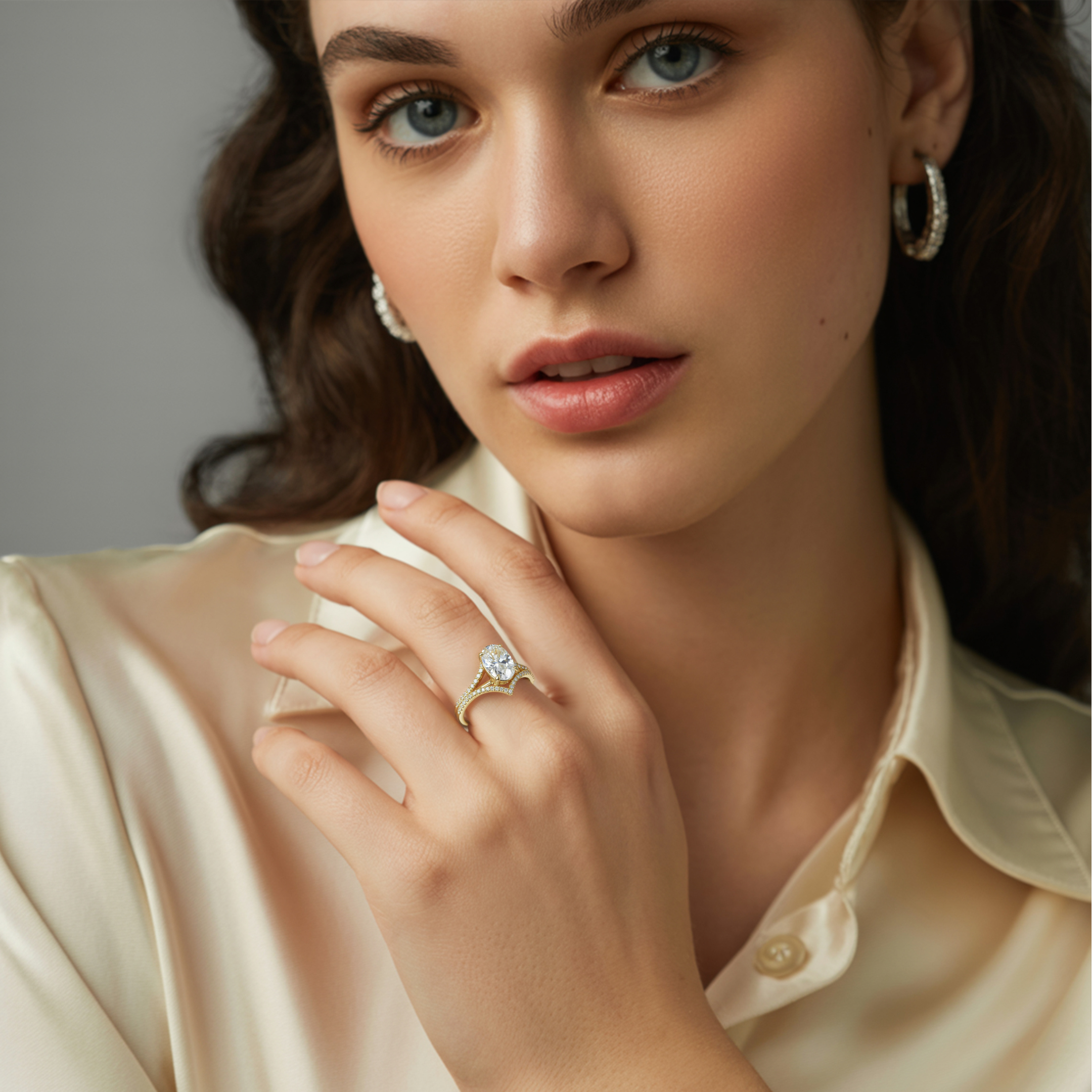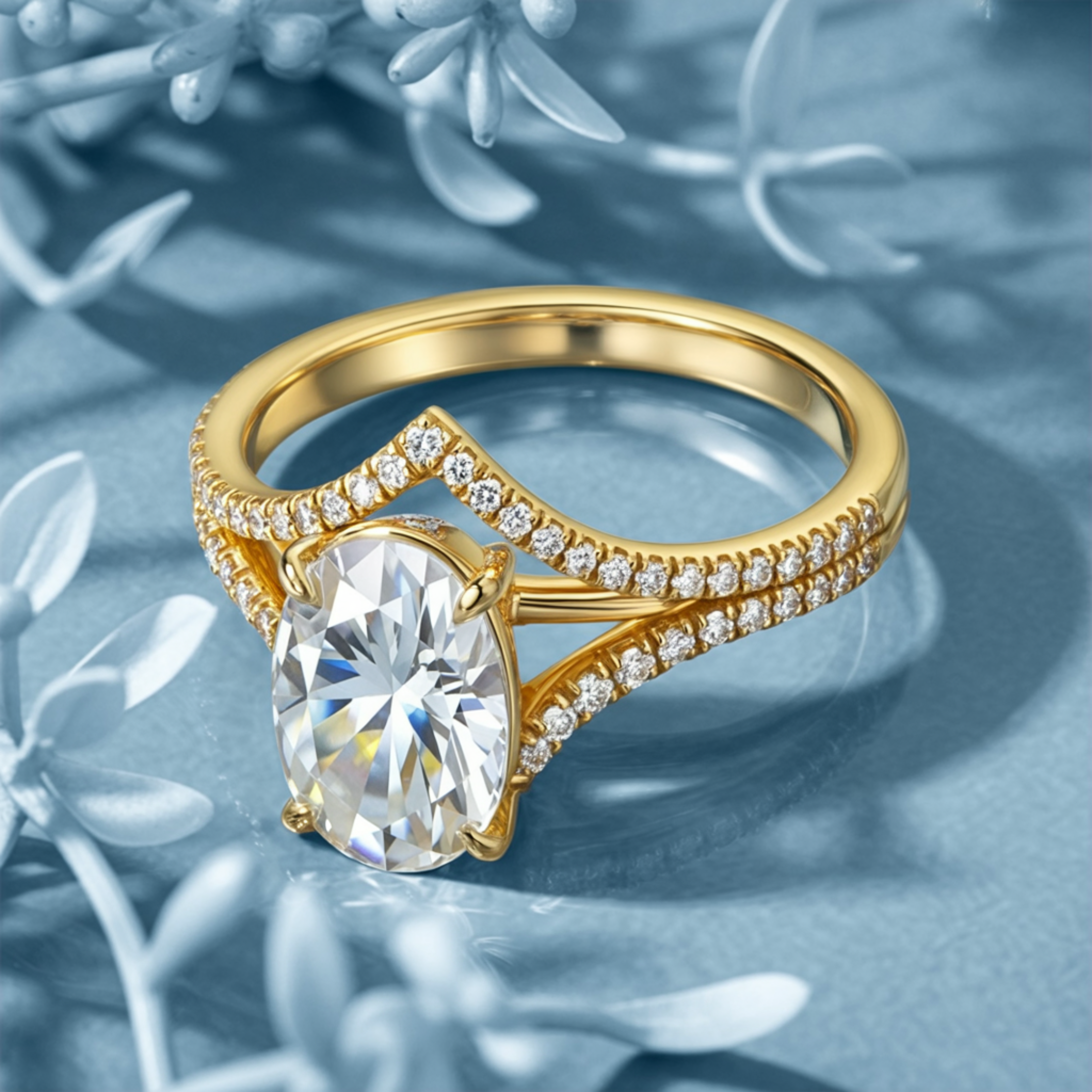 - Experience the stunning fire of a 3-carat oval moissanite showcased in our innovative bypass chevron design
