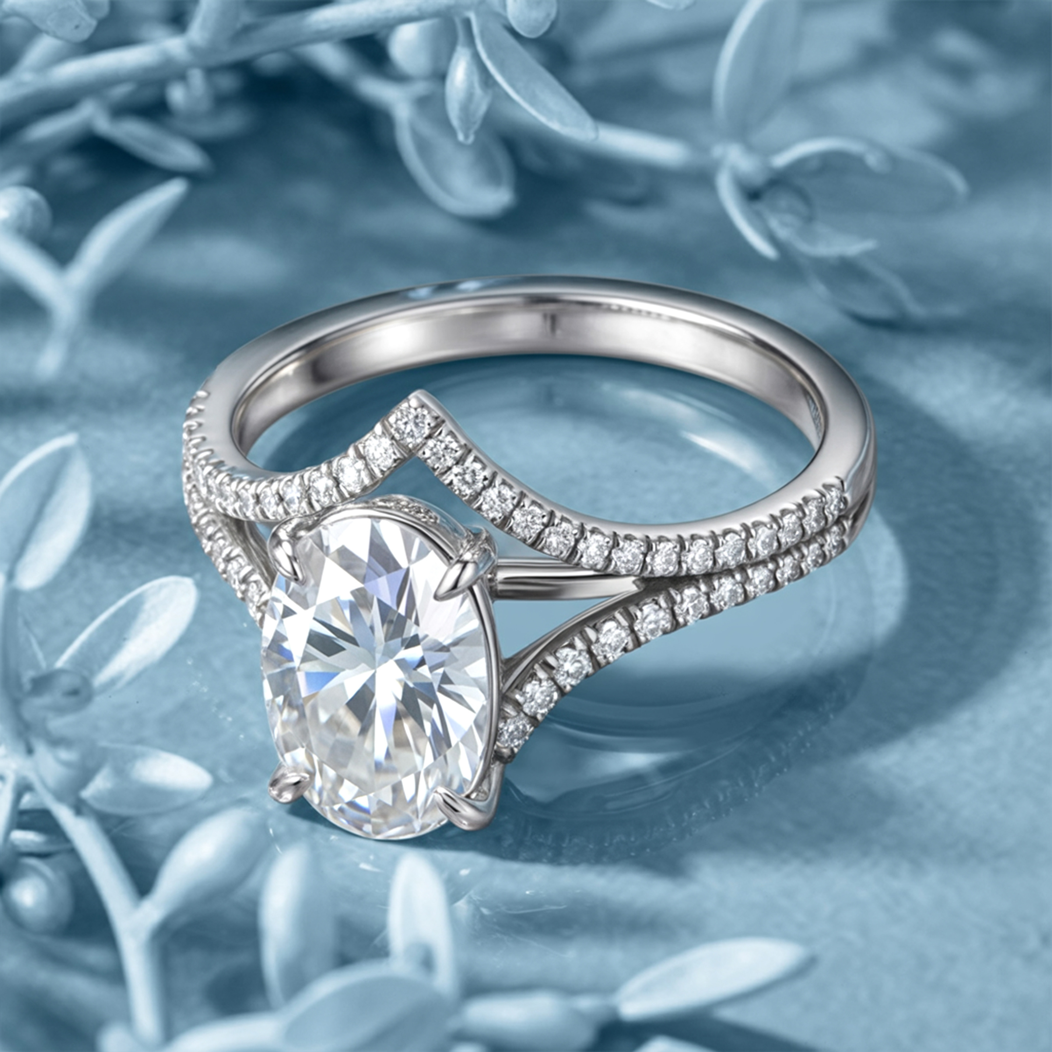 - Center Stone: 3CT Oval Cut Moissanite, D Color, VVS1 Clarity