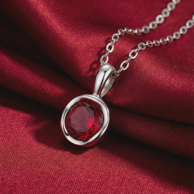 Mined rubies are often inconsistent, presenting with cloudy inclusions or a brownish tint. This July birthstone necklace features a high-performance Simulated Ruby, engineered to match the coveted "Pigeon Blood" red benchmark. Precision-cut from A5 Grade material for maximum light return and intense fire.
