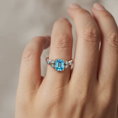 The Katalina stands as a radiant masterpiece, showcasing the beauty and brilliance of ethical high-grade blue moissanite. This exquisite vintage-inspired ring features a captivating emerald-cut center stone with its sophisticated rectangular silhouette and stepped facets, surrounded by meticulously set accent stones that enhance its Art Deco elegance.