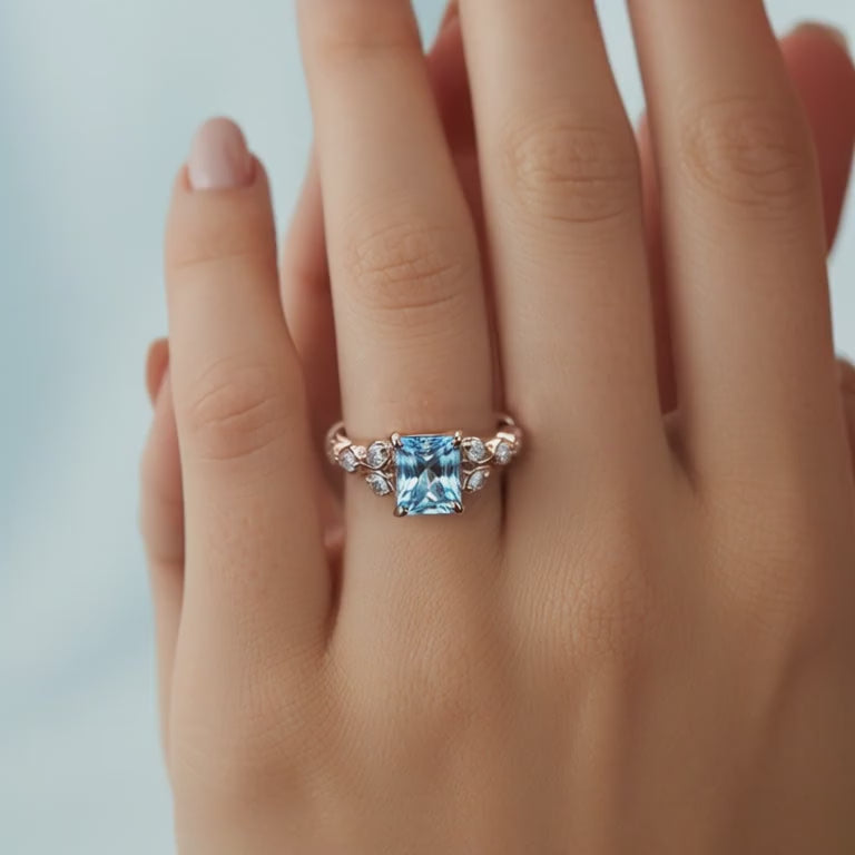 The Katalina stands as a radiant masterpiece, showcasing the beauty and brilliance of ethical high-grade blue moissanite. This exquisite vintage-inspired ring features a captivating radiant-cut center stone with its sophisticated rectangular silhouette and trimmed corners, surrounded by meticulously set accent stones that enhance its hybrid elegance and exceptional fire.