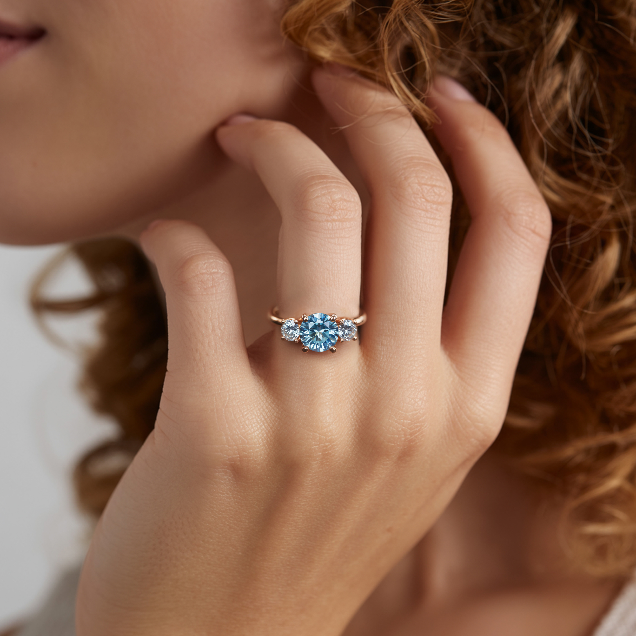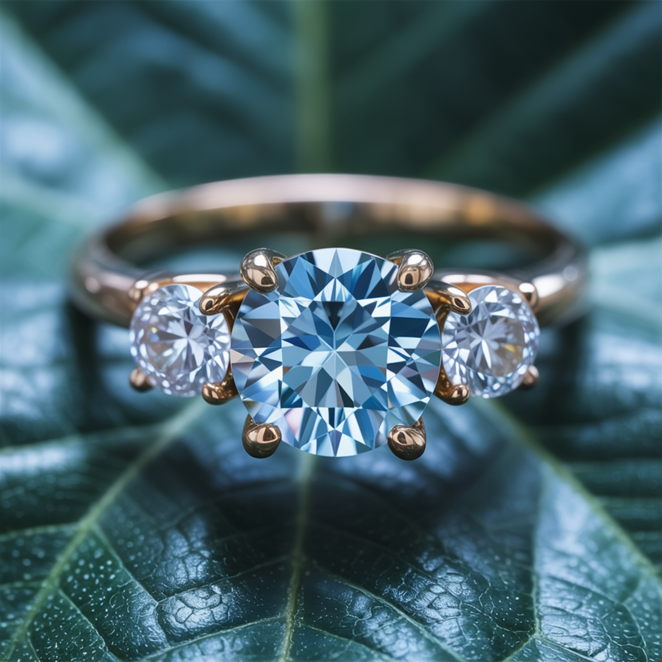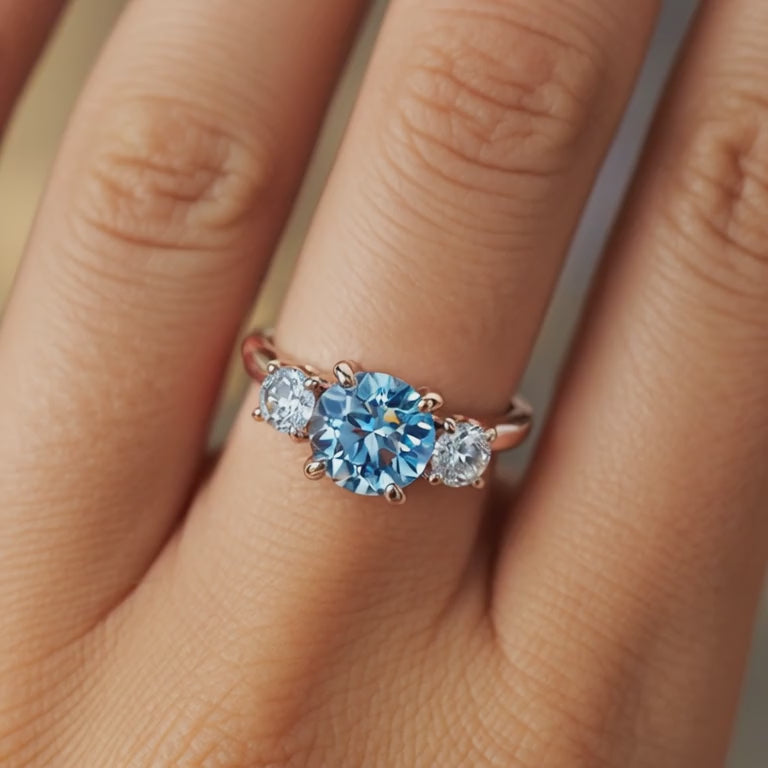 The Katalina 1.5CT Three-Stone BLue Round Cut Moissanite Ring