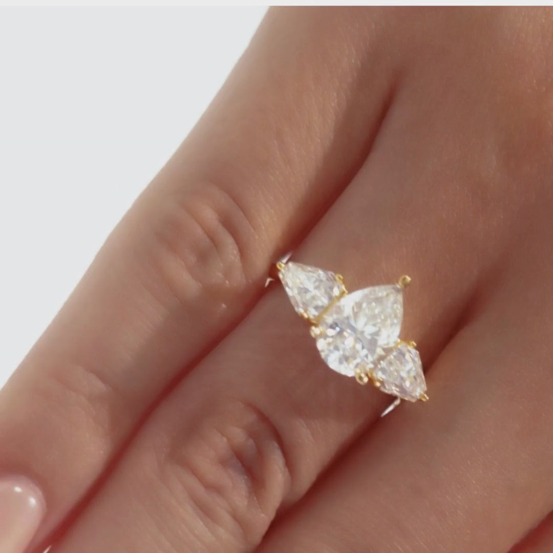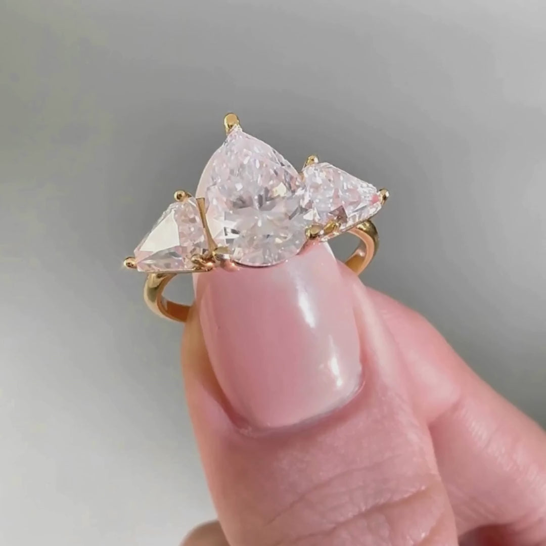 The Lily showcases a brilliant pear-cut moissanite center stone and two triangular moissanite accent stones, each set in a secure prong setting on a band of premium S925 Sterling Silver. Its sleek design balances luxury and simplicity, making it perfect for both everyday wear and special occasions.