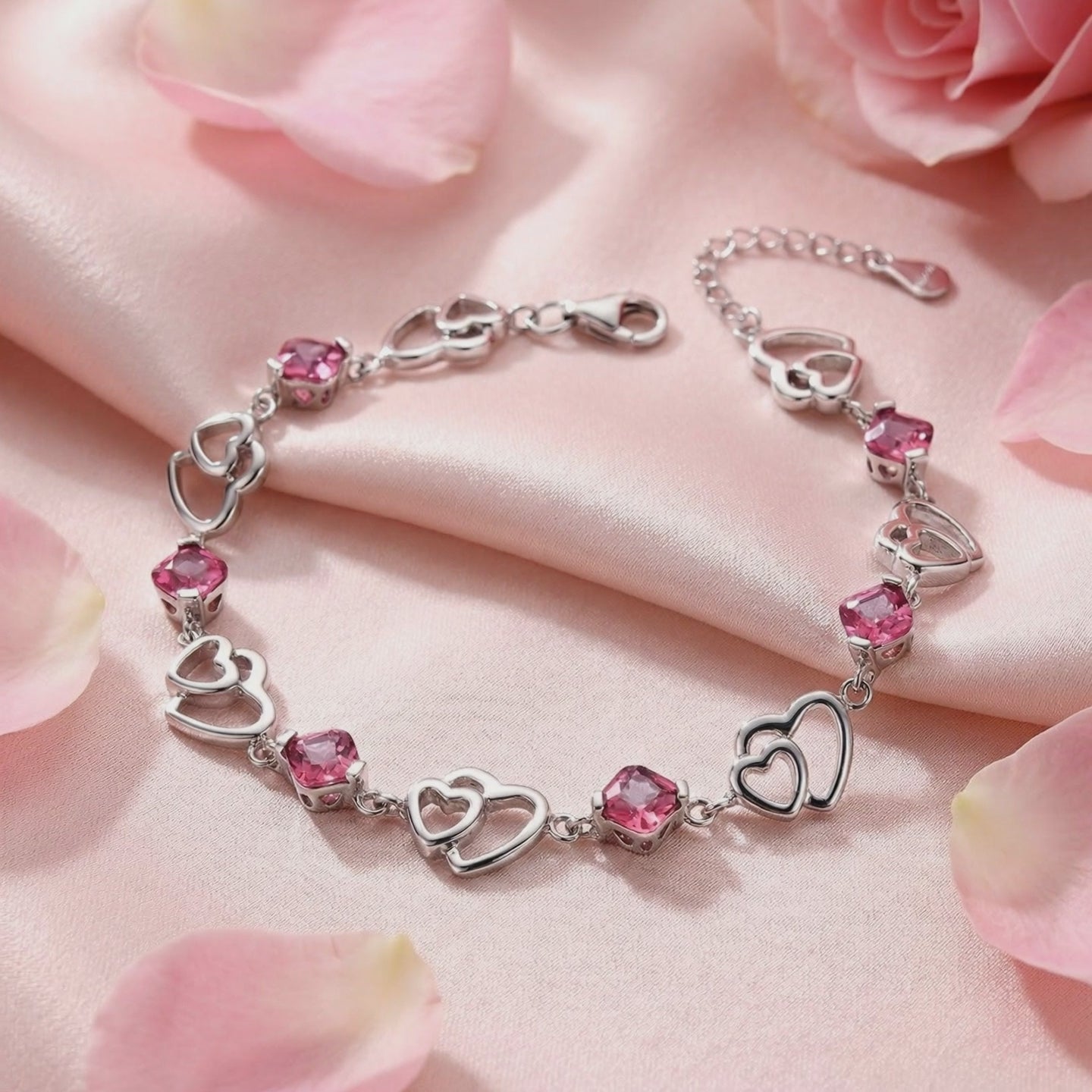Nature rarely delivers consistency. Mined pink tourmalines are often cloudy or uneven in tone. The Lucerienne heart bracelet features high-performance Simulated Pink Tourmaline, color-calibrated to achieve a vivid raspberry brilliance and exceptional clarity that rivals museum-grade gems. Each stone is precision-cut to maximize light return and fire.