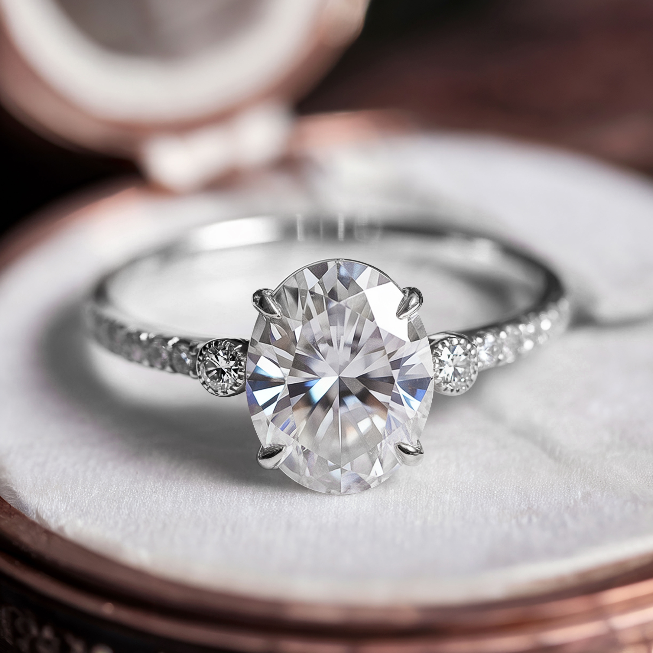- 3CT Oval Cut Moissanite – Enhanced size for bold brilliance
