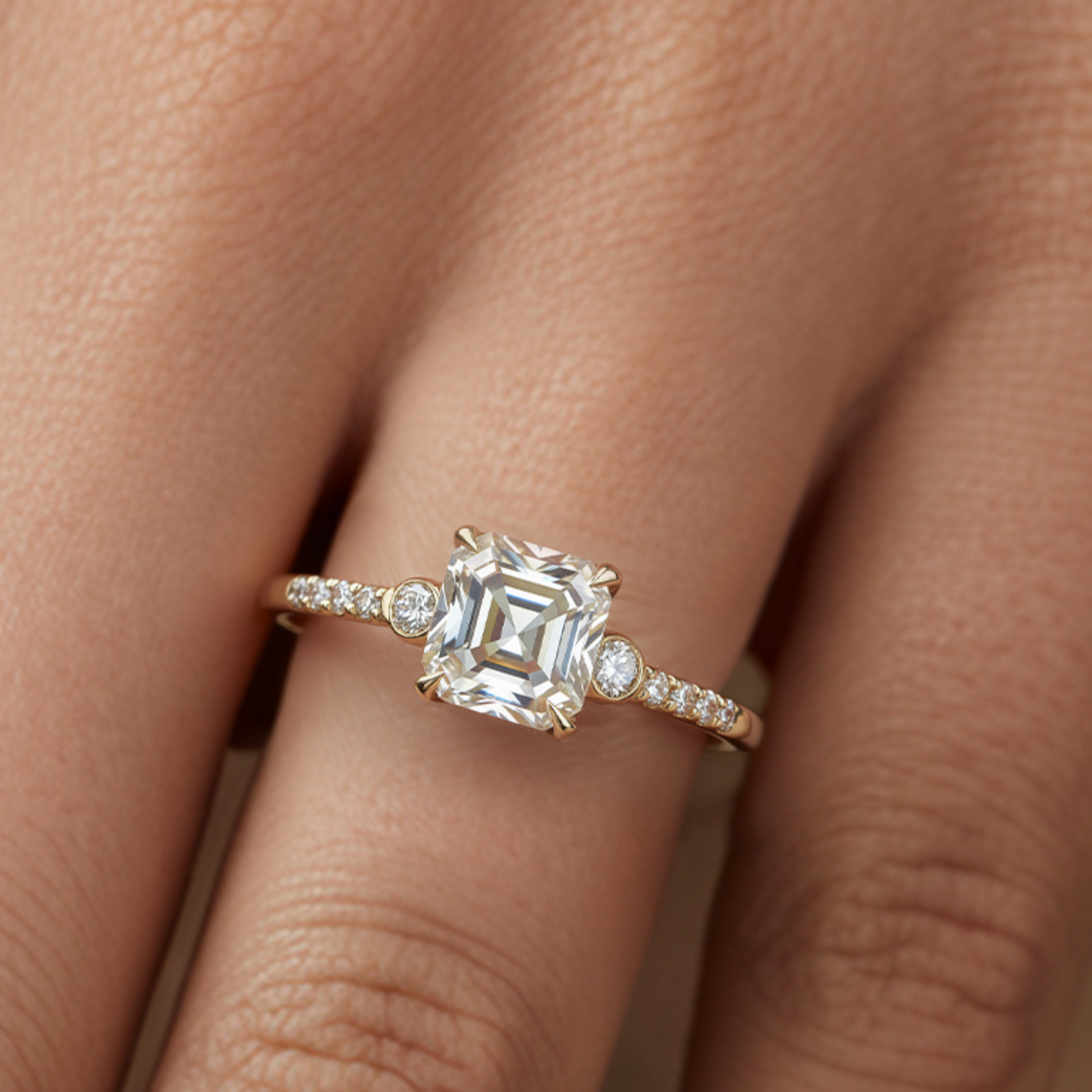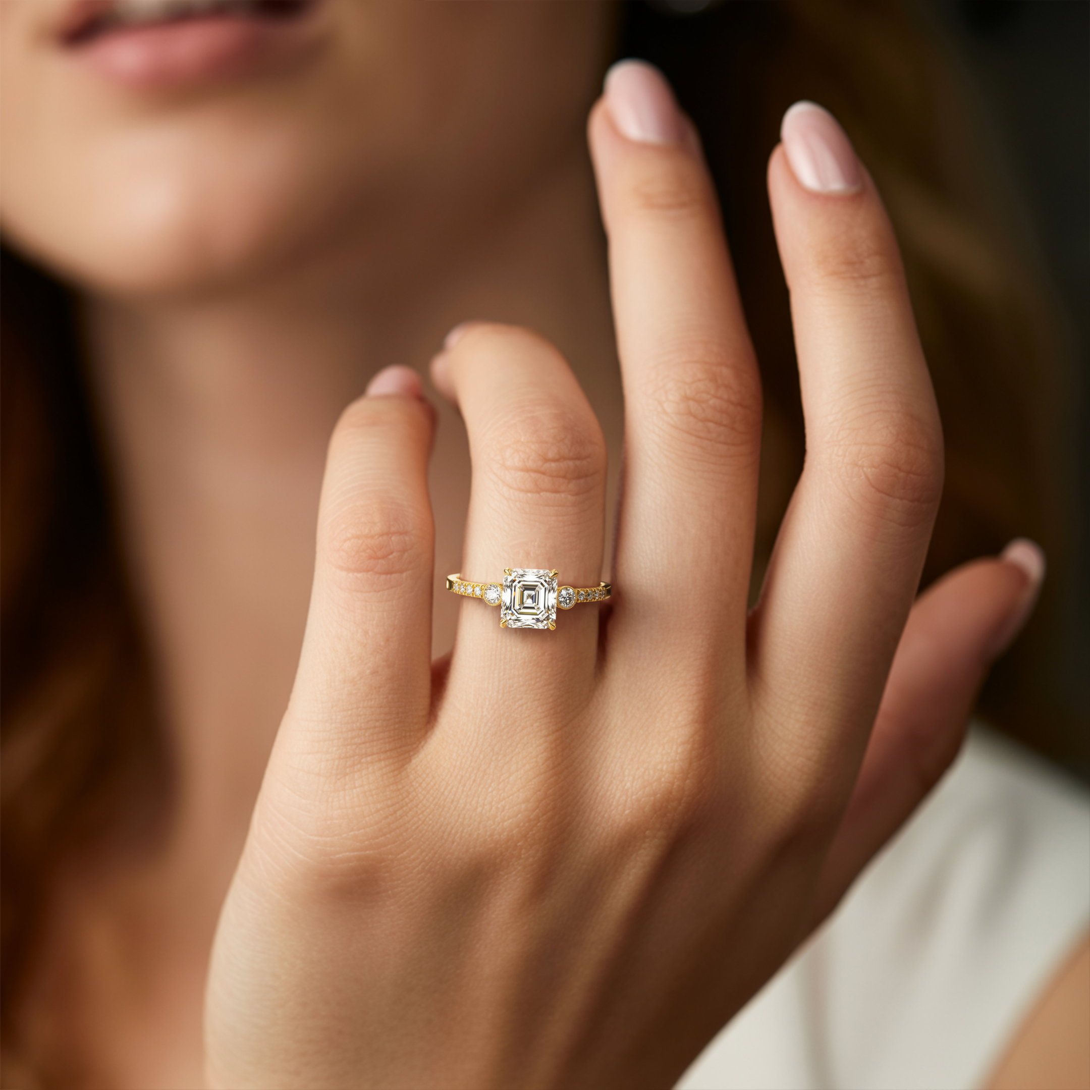 This isn't just any ring; it's a statement piece with an Asscher cut that truly stands out. Imagine clean, geometric lines catching the light, creating a dazzling hall of mirrors effect as you move your hand. It’s a moment she'll cherish, a symbol of your unique and sophisticated love.