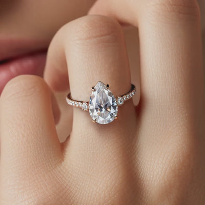 - Elegant Pear-Cut Moissanite: A unique 2CT D-color flawless gemstone that beautifully catches the light and flatters her hand.