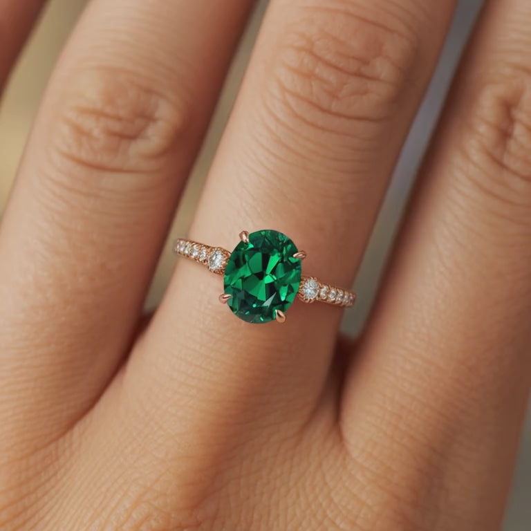 This ring isn't just jewelry; it's a moment she'll cherish forever. The centerpiece is a breathtaking 2CT Oval Cut Green moissanite, radiating nature's luxurious charm. Its verdant hue brings an exotic elegance, perfectly complementing her unique spirit and making a statement as unforgettable as your love.