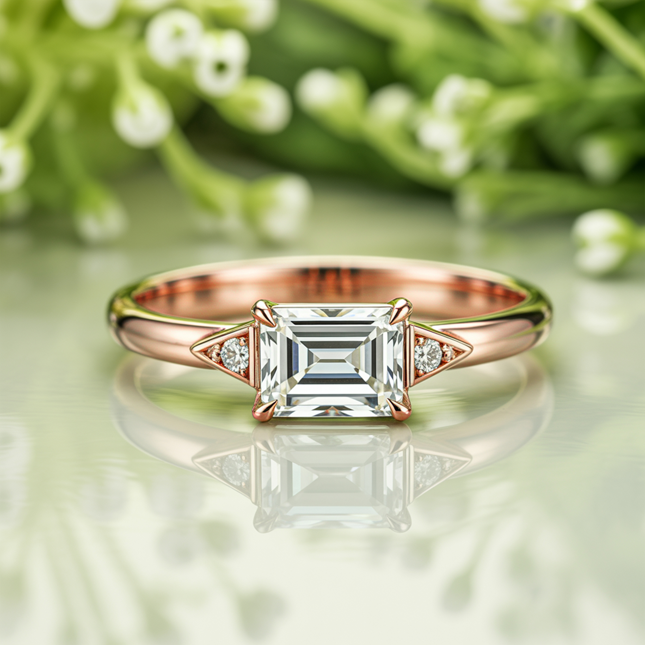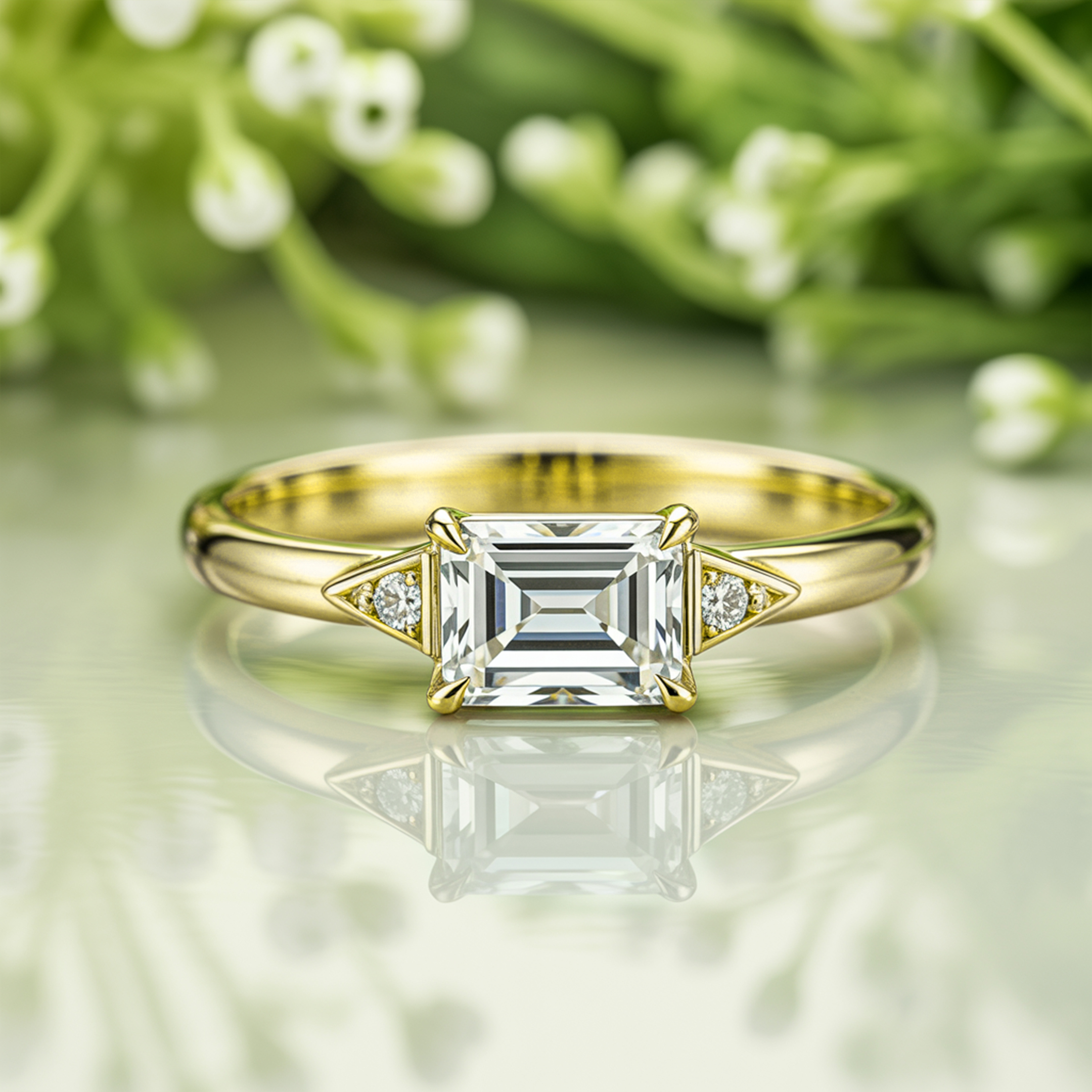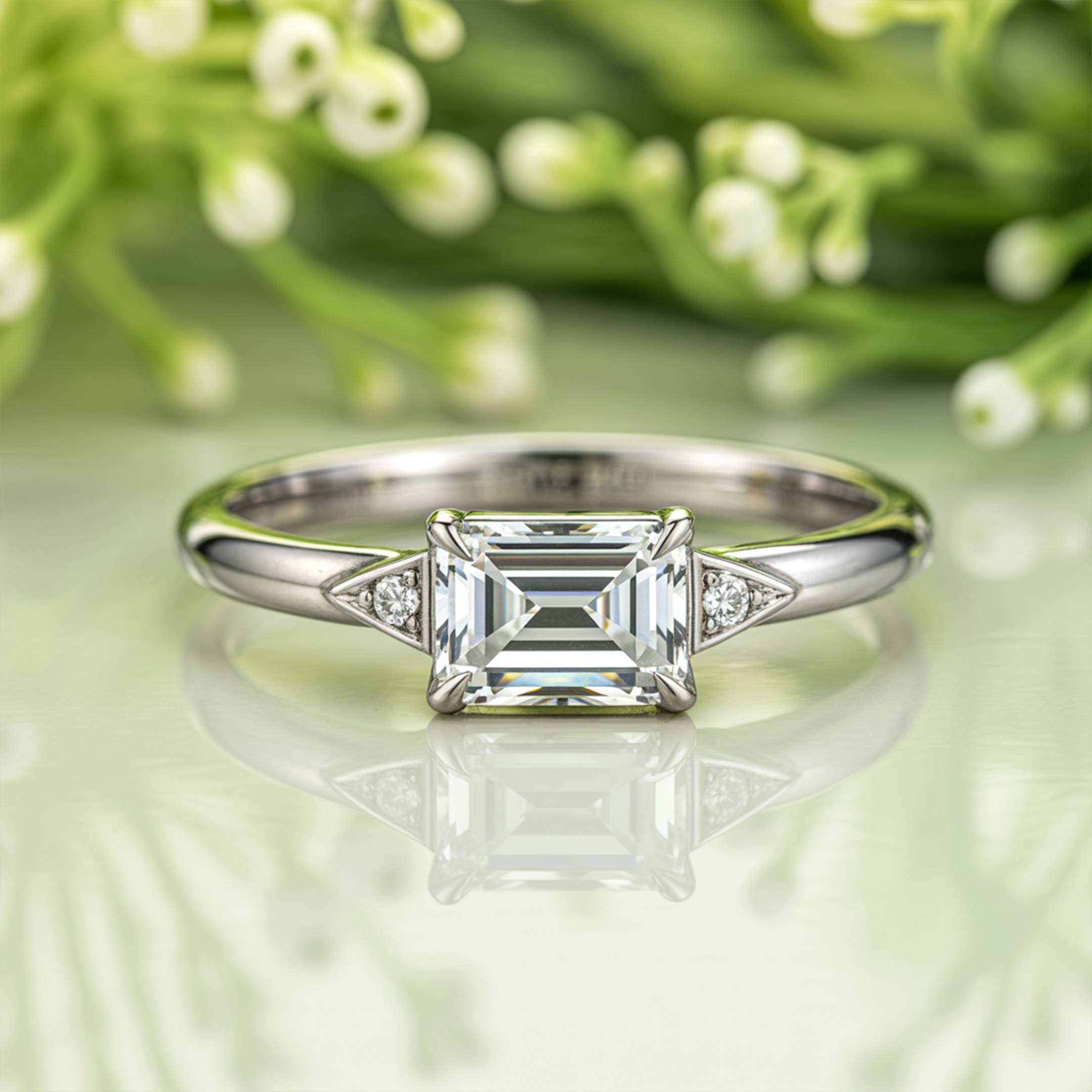 The Lyra redefines modern elegance with its distinctive east-west emerald cut moissanite, a design that commands attention and admiration.