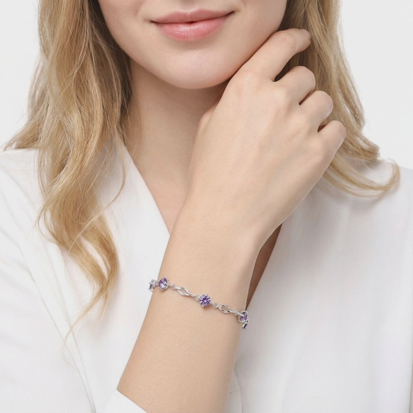 Mined amethysts often vary in shade and clarity, making it nearly impossible to find a perfectly matched set for a station bracelet. We engineered the solution. This bracelet features six precision-cut Simulated Amethysts, color-calibrated to achieve the ideal deep violet hue consistently across every stone. No cloudy inclusions. No pale centers. Just optically perfect saturation.