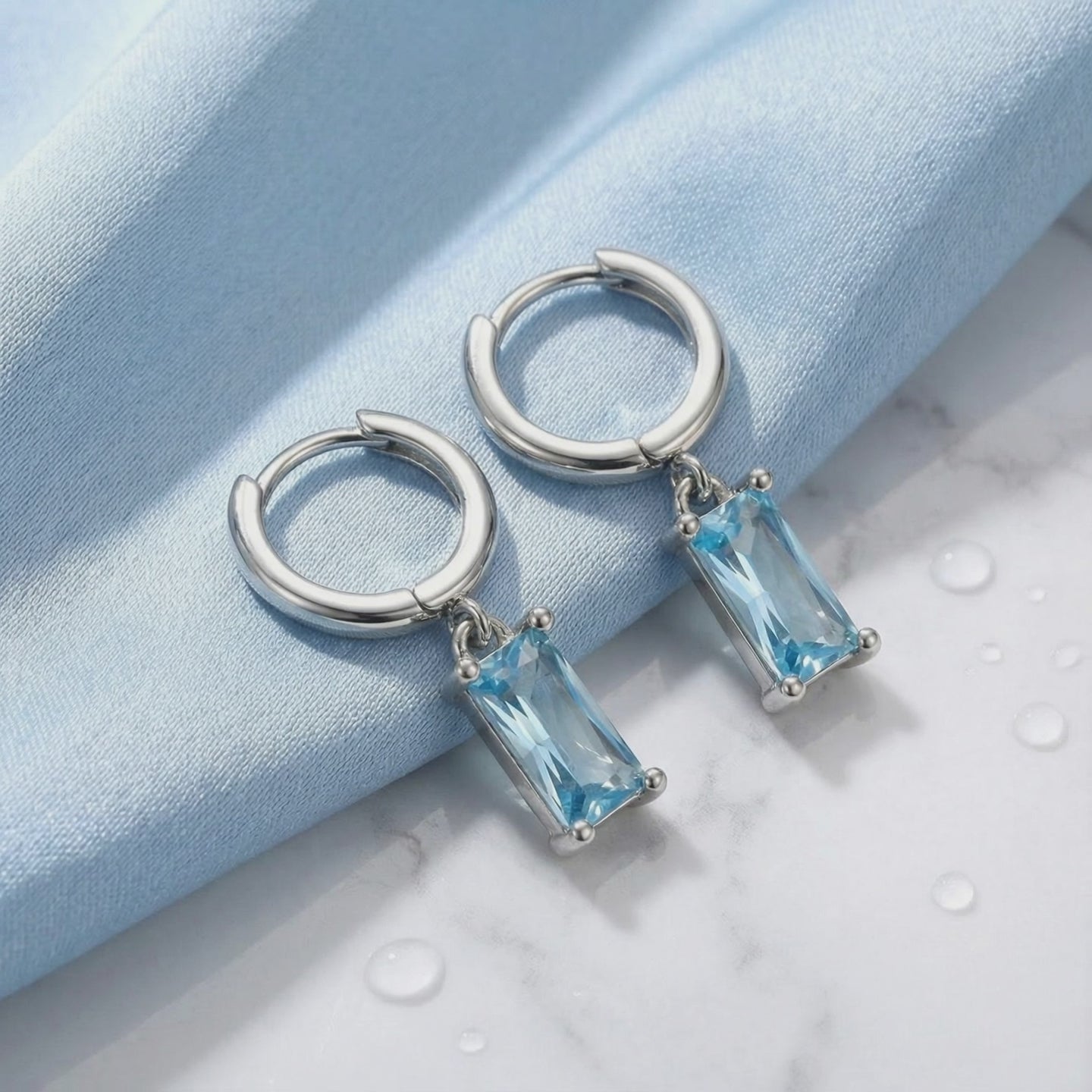 Nature rarely delivers a stone this flawless. These hoop earrings are engineered with Simulated Aquamarine, color-calibrated to achieve the ideal "Ocean Blue" saturation that mined stones struggle to replicate. Each rectangular-cut stone is precision-faceted for maximum light return, ensuring they capture attention from every angle.