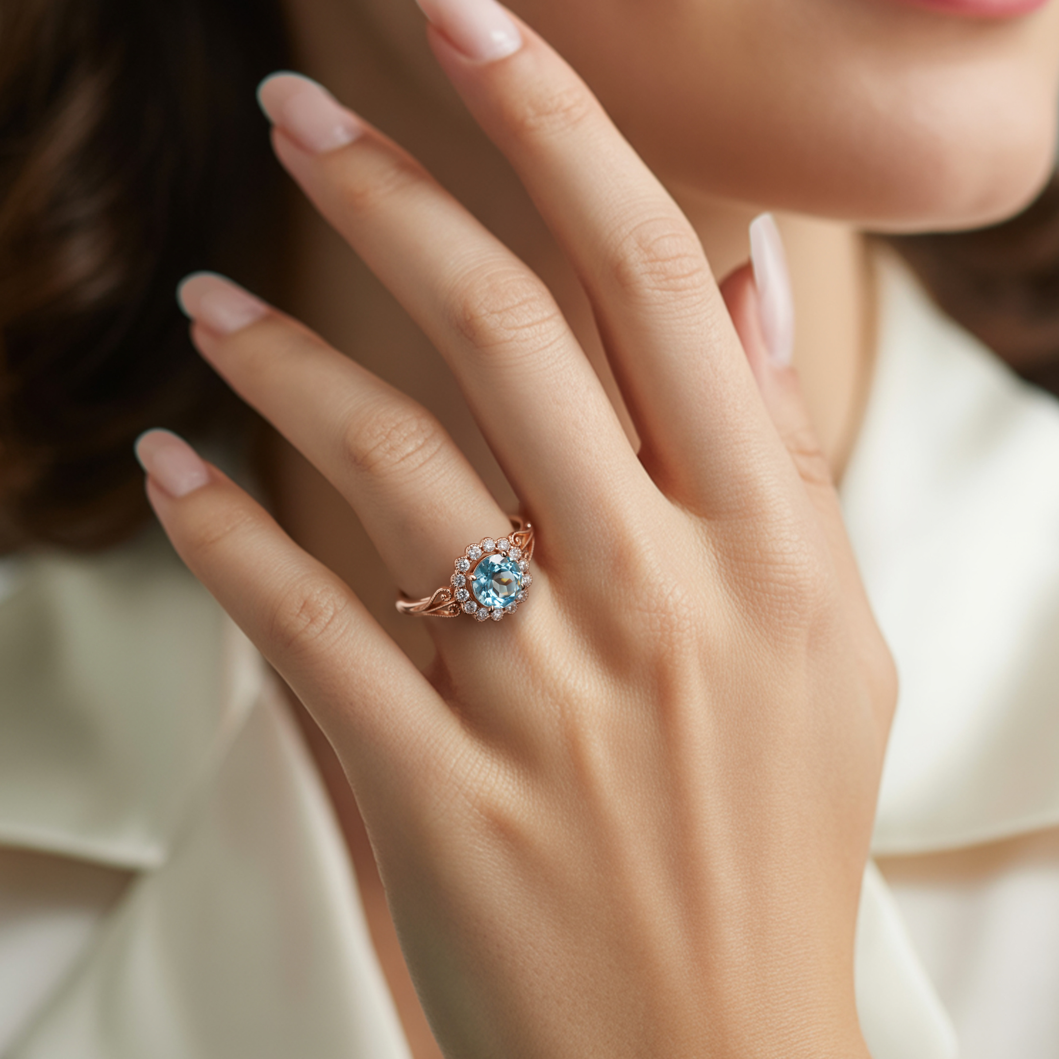 The Marinella features a brilliant 3 carat Round cut blue moissanite center stone, framed by a delicate halo of shimmering accent stones that enhance its vibrant hue. The vintage-inspired design, coupled with the warm glow of 18K Rose Gold Vermeil, creates a harmonious and sophisticated aesthetic. Side stones on the band further elevate its sparkle, making it a true statement of refined taste.