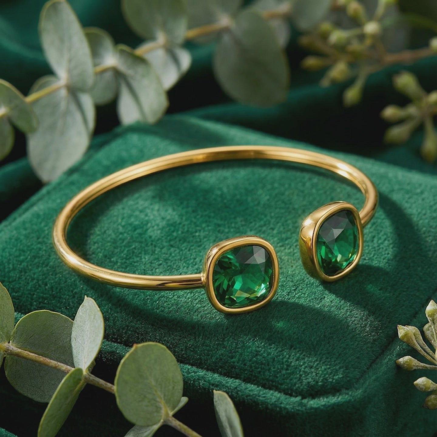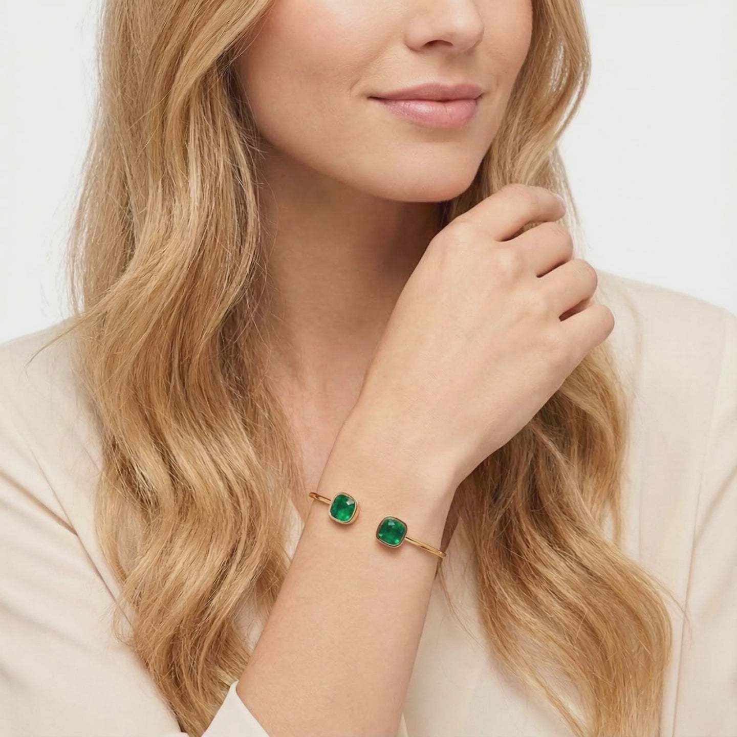 Precision-engineered to replicate the deep, vivid green of museum-grade emeralds, this Simulated Emerald cuff bracelet delivers the visual profile of a stone that would cost thousands if mined. We color-calibrated the saturation to ensure a flawless, rich green that remains vibrant and clear, rejecting the inclusions and clouds found in natural stones.