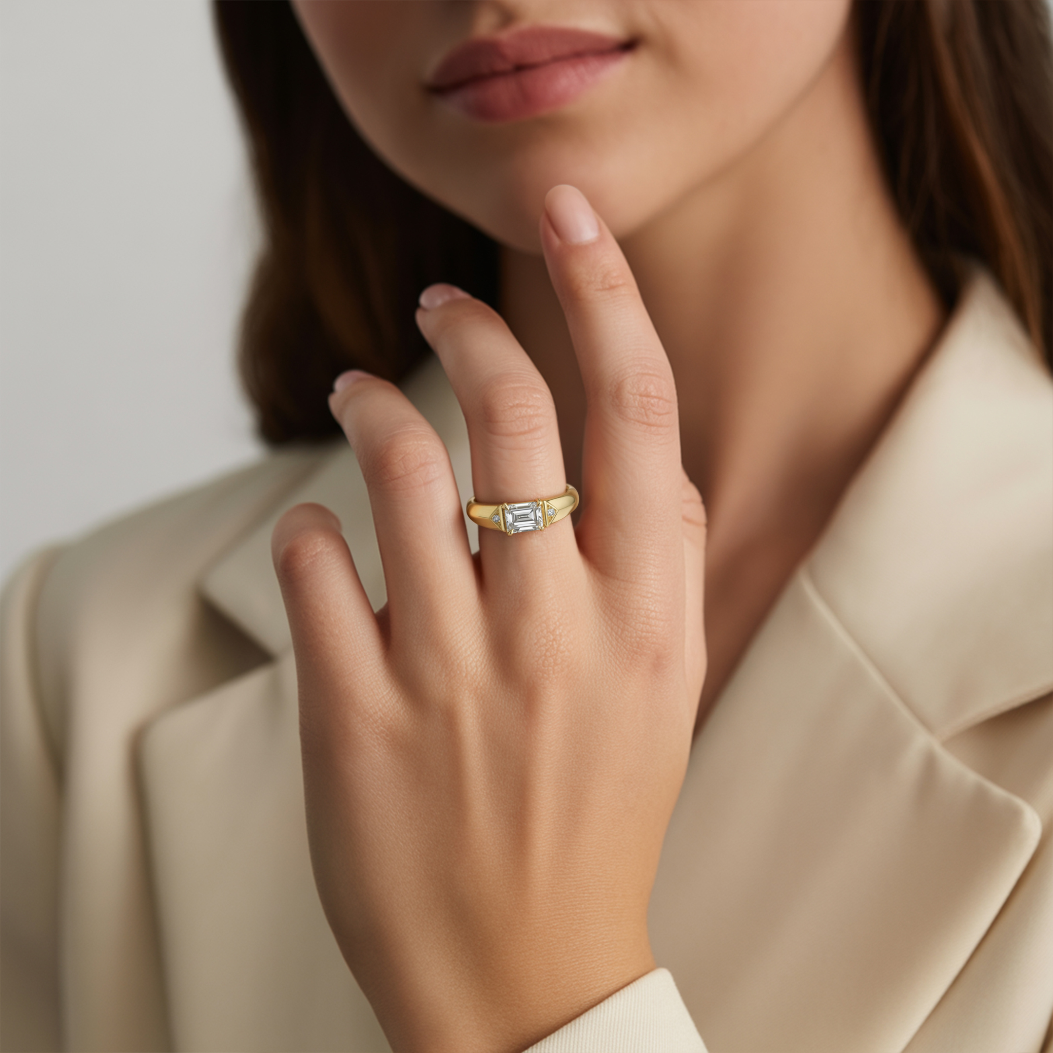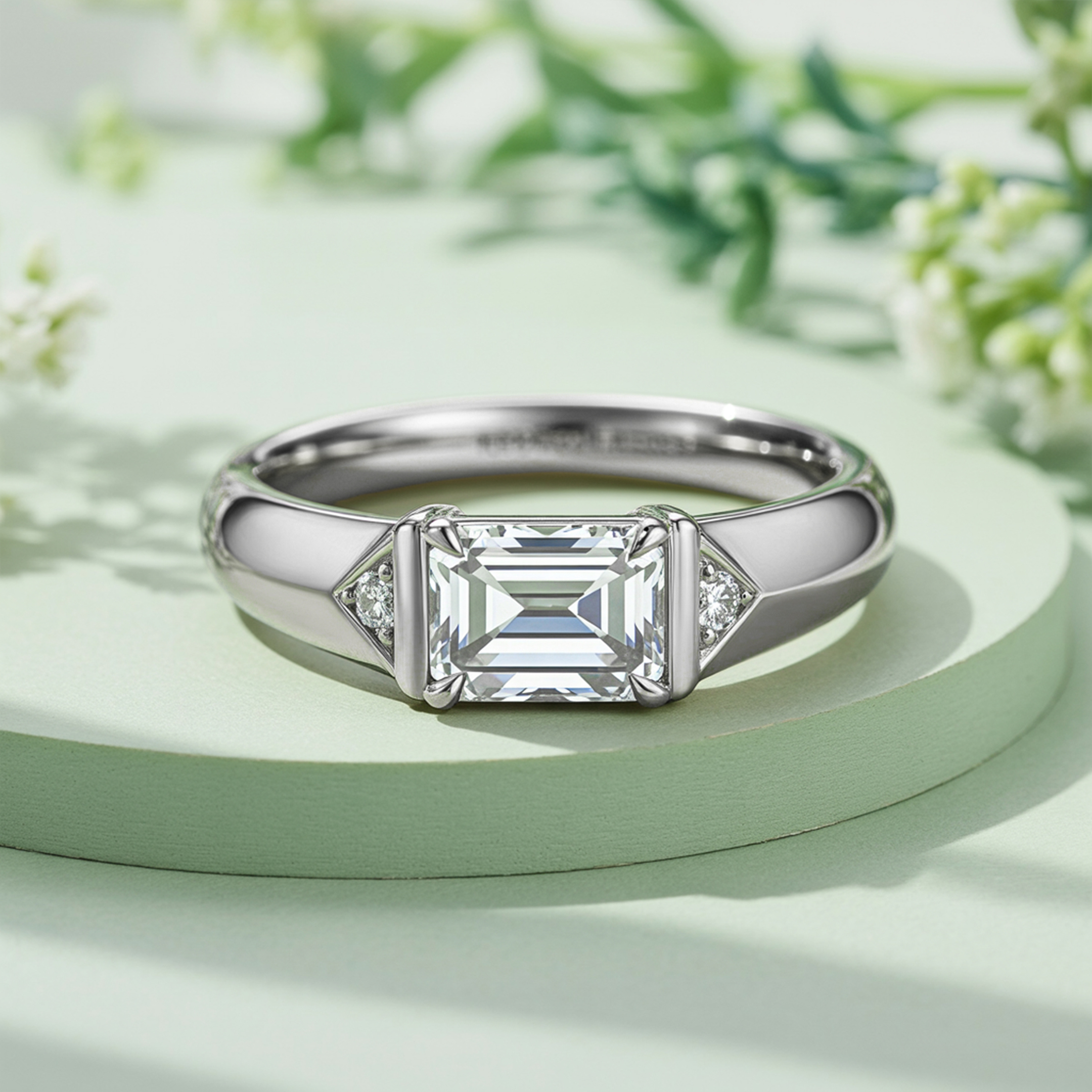 This unique piece showcases a brilliant emerald-cut moissanite, securely held in a sleek bezel setting with a contemporary east-west orientation. The knife-edge band, subtly adorned with side stones, draws the eye to the center gem while providing a comfortable and refined profile that truly stands out.