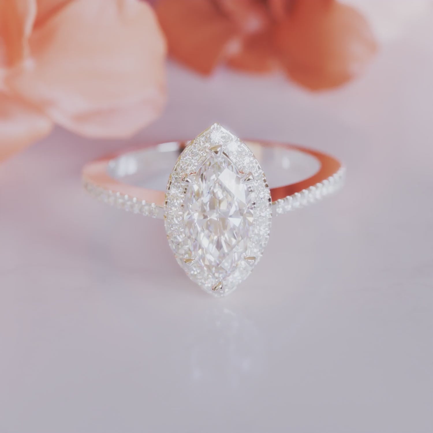 The Ideal Marquise Cut Moissanite stone, enhanced by a halo of smaller moissanite, creates a mesmerizing sparkle that captures attention from every angle.