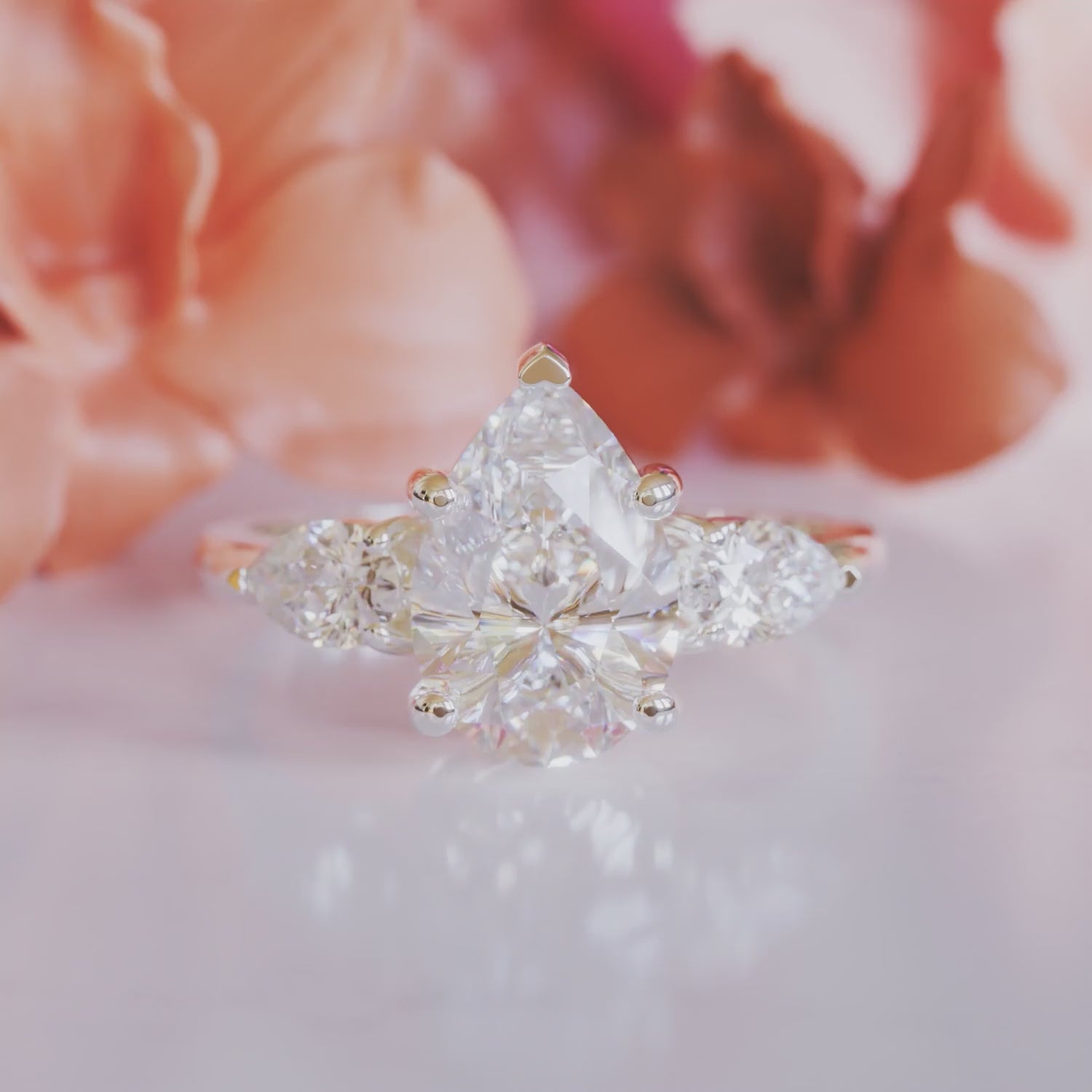 Meet The Nola—a ring that’s as unforgettable as the moments it’s made for. With a breathtaking 4CT ideal pear-cut moissanite at its center, this ring is the ultimate choice for engagements, anniversaries, or a well-deserved gift to yourself. Its triple stone prong setting, adorned with ethically sourced side stones, creates a timeless design that radiates elegance and meaning.